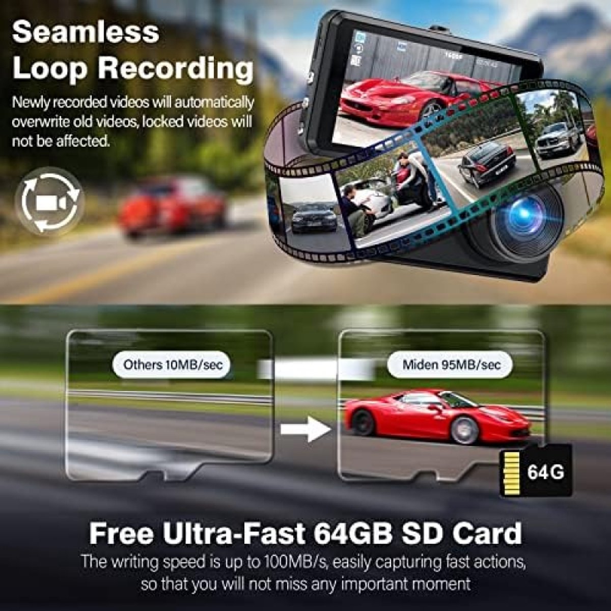 2,5 K + 1080p FHD & 336° groothoek dual opname: De S7 dashcam auto voor achter van Miden biedt Ultra HD 2,5 K (2560 x 1600P) frontvideo + FHD 1080p backvideo. Het vangt belangrijke details zoals verkeersborden en kentekenplaten duidelijk op voor meer rijplezier en veiligheid. Voorzien van een 176°-groothoekcamera aan de voorkant en een waterdichte 160°-groothoek-achtercamera voor een volledige registratie zonder dode hoeken.