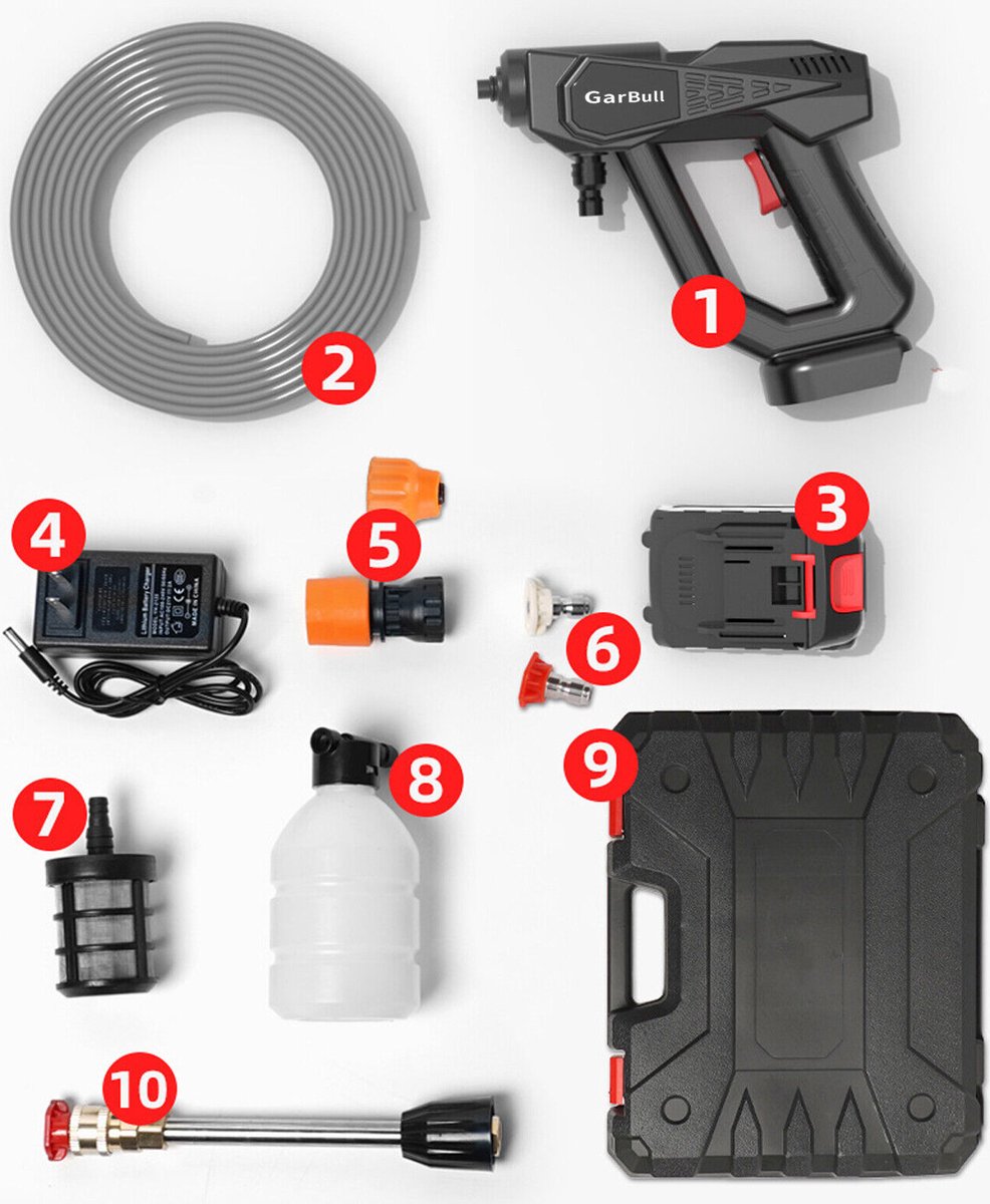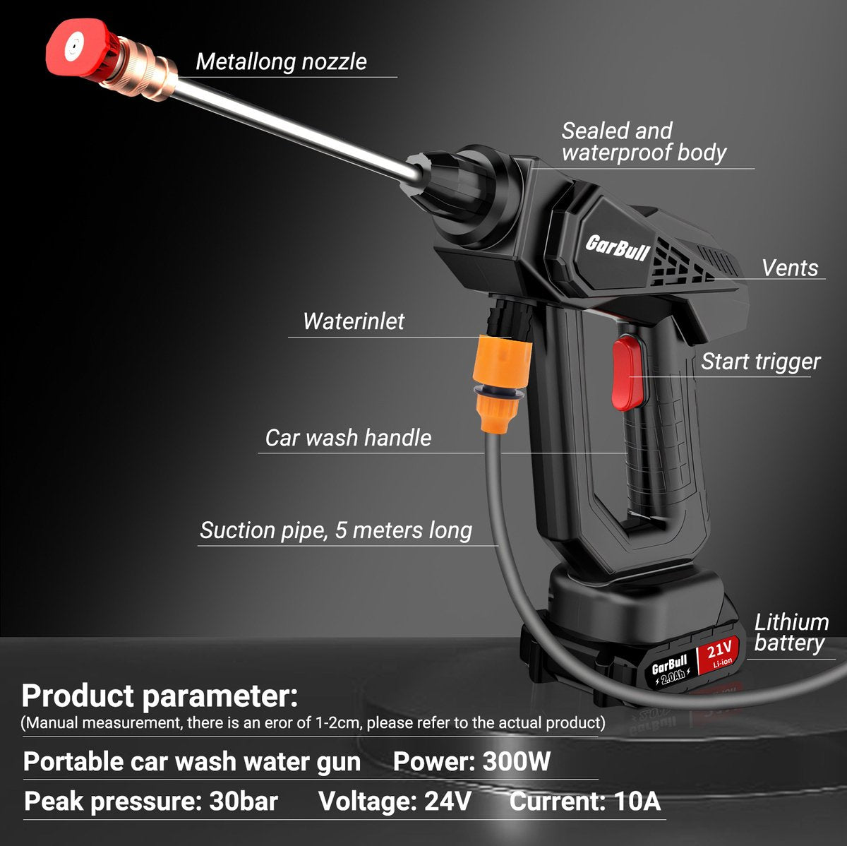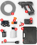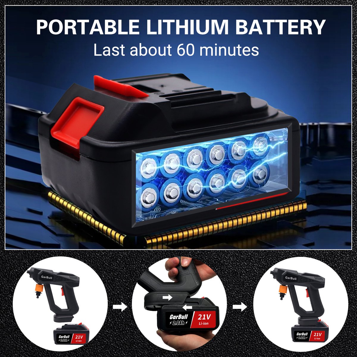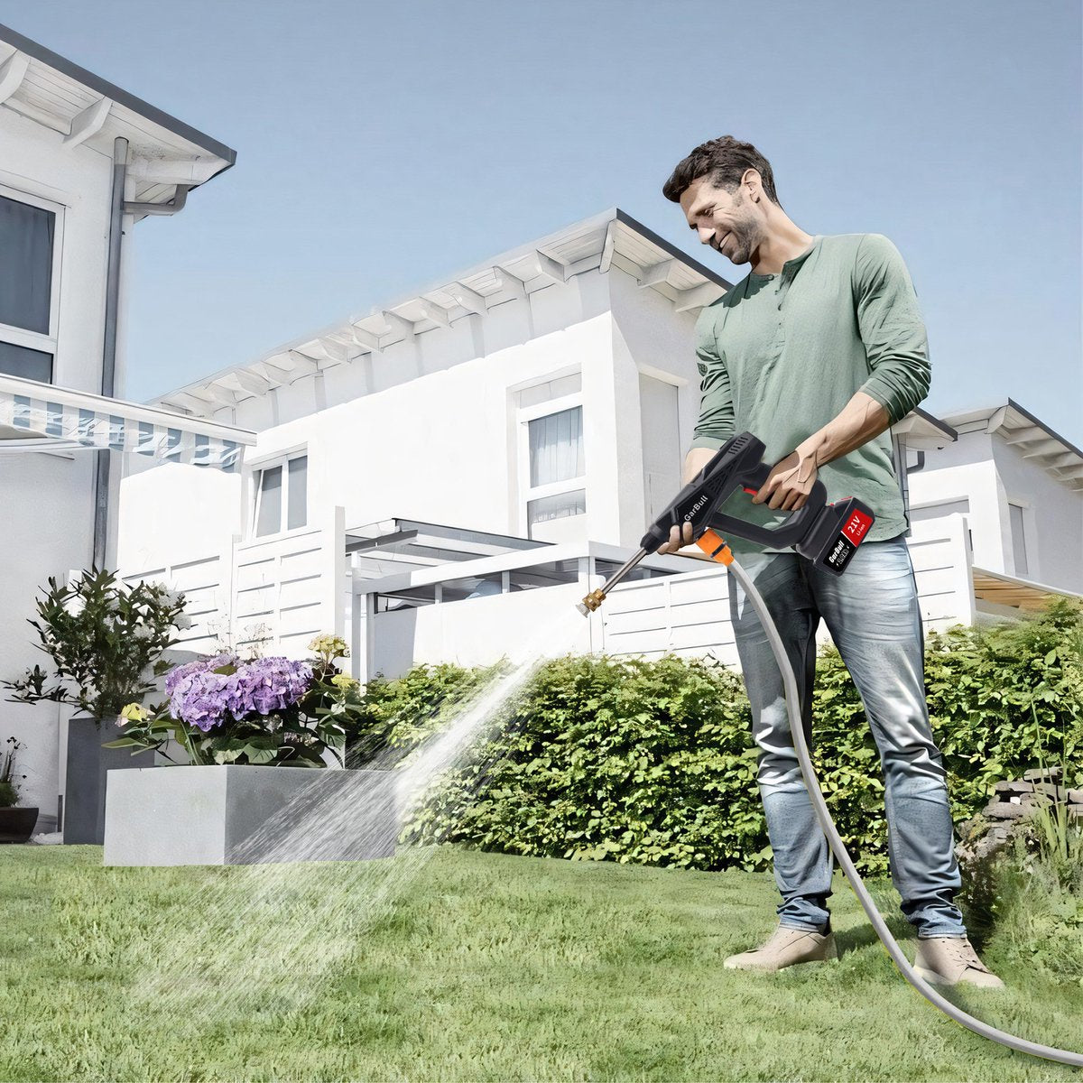 [Krachtige kernloze hogedrukreiniger] De draagbare snoerloze hogedrukreiniger biedt een reinigingsdruk tot 60 bar en een debiet van 1,5 GP, wat 5 keer meer is dan een normale tuinslang. Met de draagbare hogedrukreiniger kun je alle buitenruimtes snel en gemakkelijk schoonmaken.