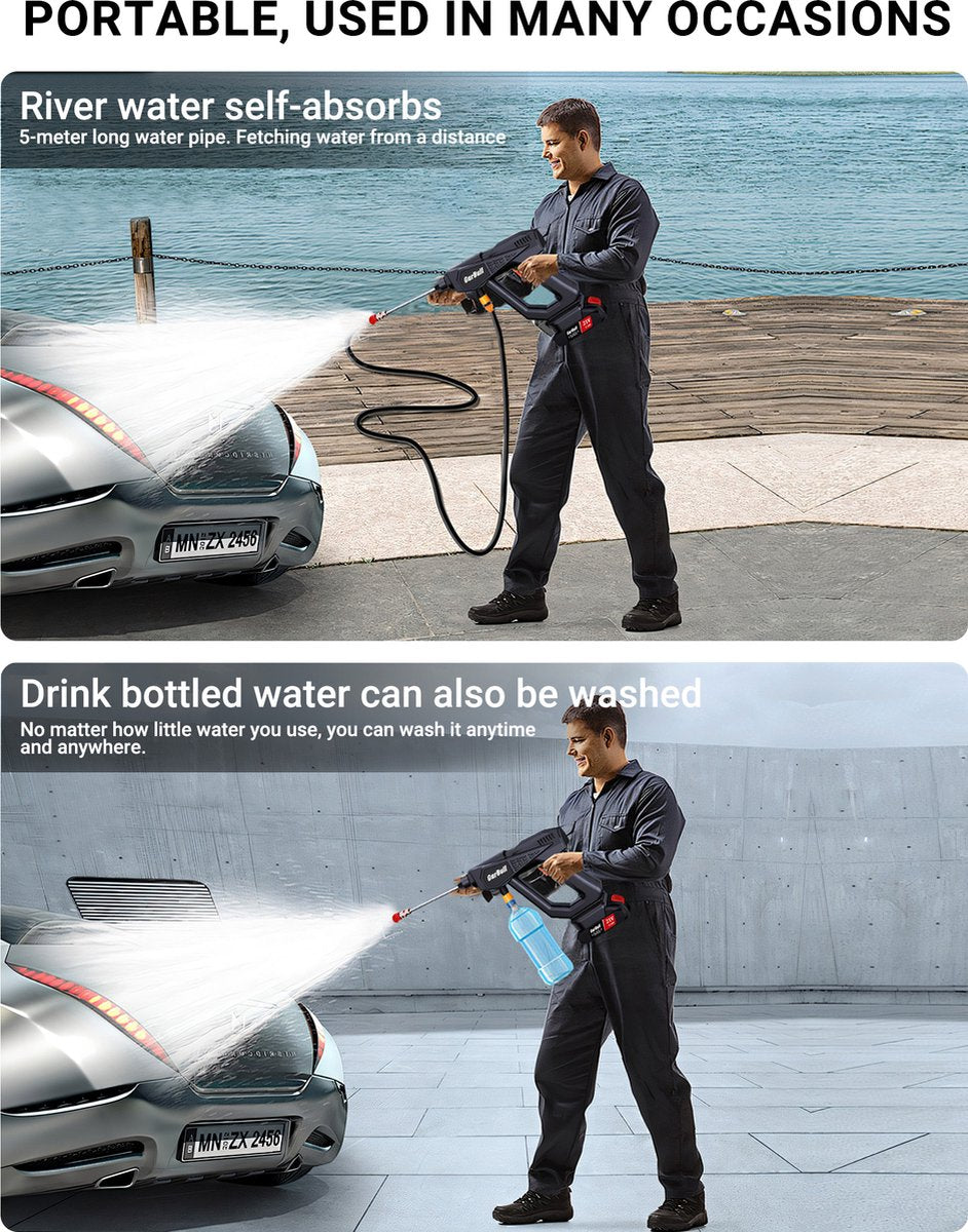 Deze lichtgewicht snoerloze hogedrukreiniger werkt op batterijen en weegt ongeveer 1,5 kg. Het compacte snoerloze ontwerp is gemakkelijk mee te nemen. Dankzij de zelfaanzuigende functie kun je overal water opzuigen, zoals emmers, zwembaden, rivieren, enz.