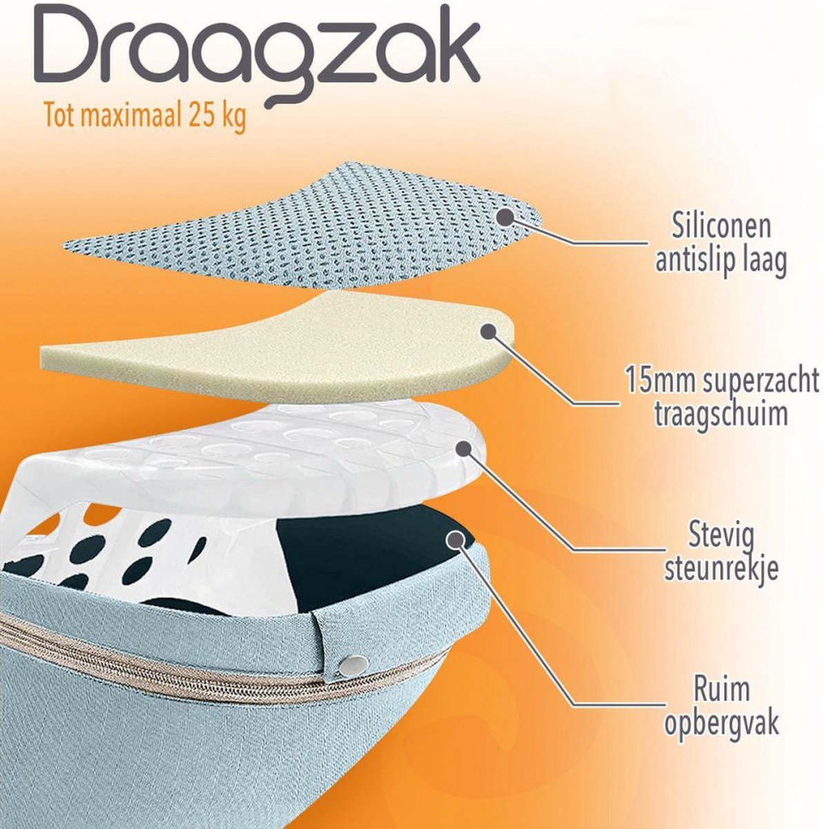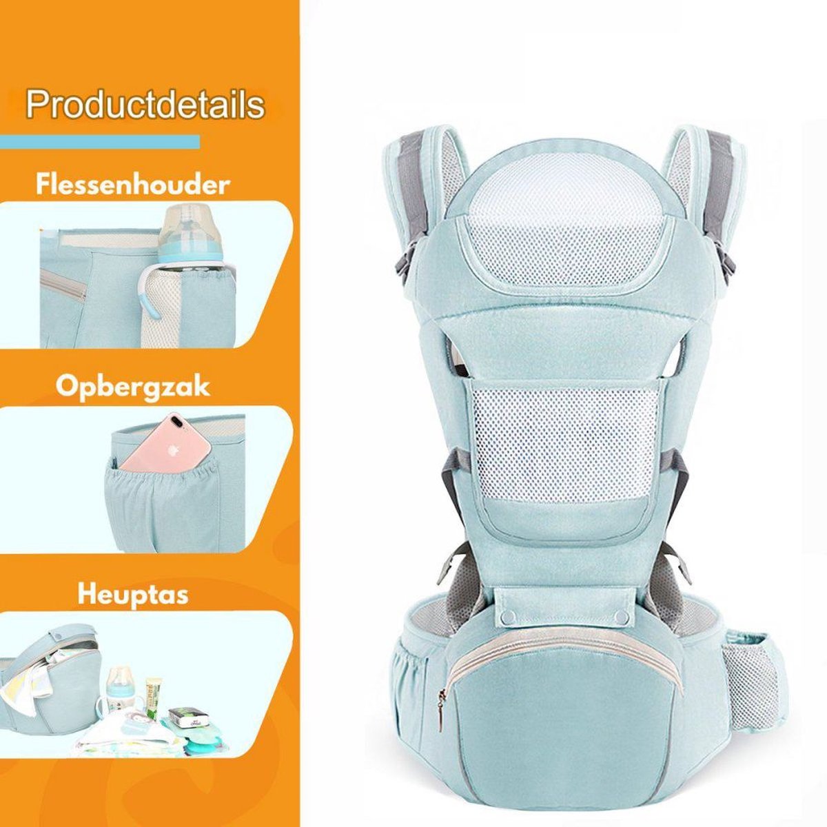 De zakken aan beide zijdes zijn handig voor het opbergen van melkflessen, telefoons, sleutels, doekjes, etc.. In het heupzitje zit naast het stevige steunrekje ook een ruim opbergvak voor nog meer spullen. Het heupzitje zelf voelt comfortabel aan door het zachte traagschuim. Bovenop het zitje zit een antislip laag voor de veiligheid van je kind. De meerdere klikgespen, drukknopen en het maken het draagsysteem nog veiliger.