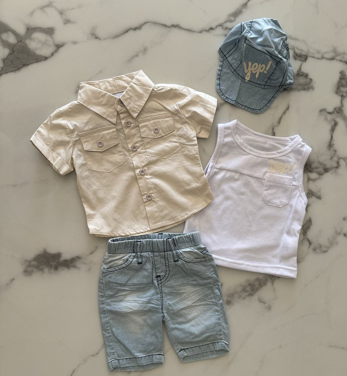 Deze babyjongenssetje bestaat uit een denim korte broek, tank top, een overhemd en een leuk petje!