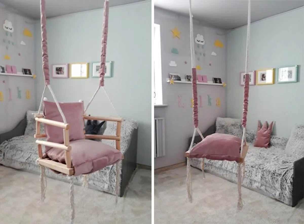 Onze Babyschommel is een prachtig meubelstuk voor een kinderkamer, dat een sprookjesachtige sfeer zal introduceren en uw jeugd tot een onvergetelijk avontuur zal maken. Erg leuk voor de jongste kinderen (ongeveer 8 maanden oud).