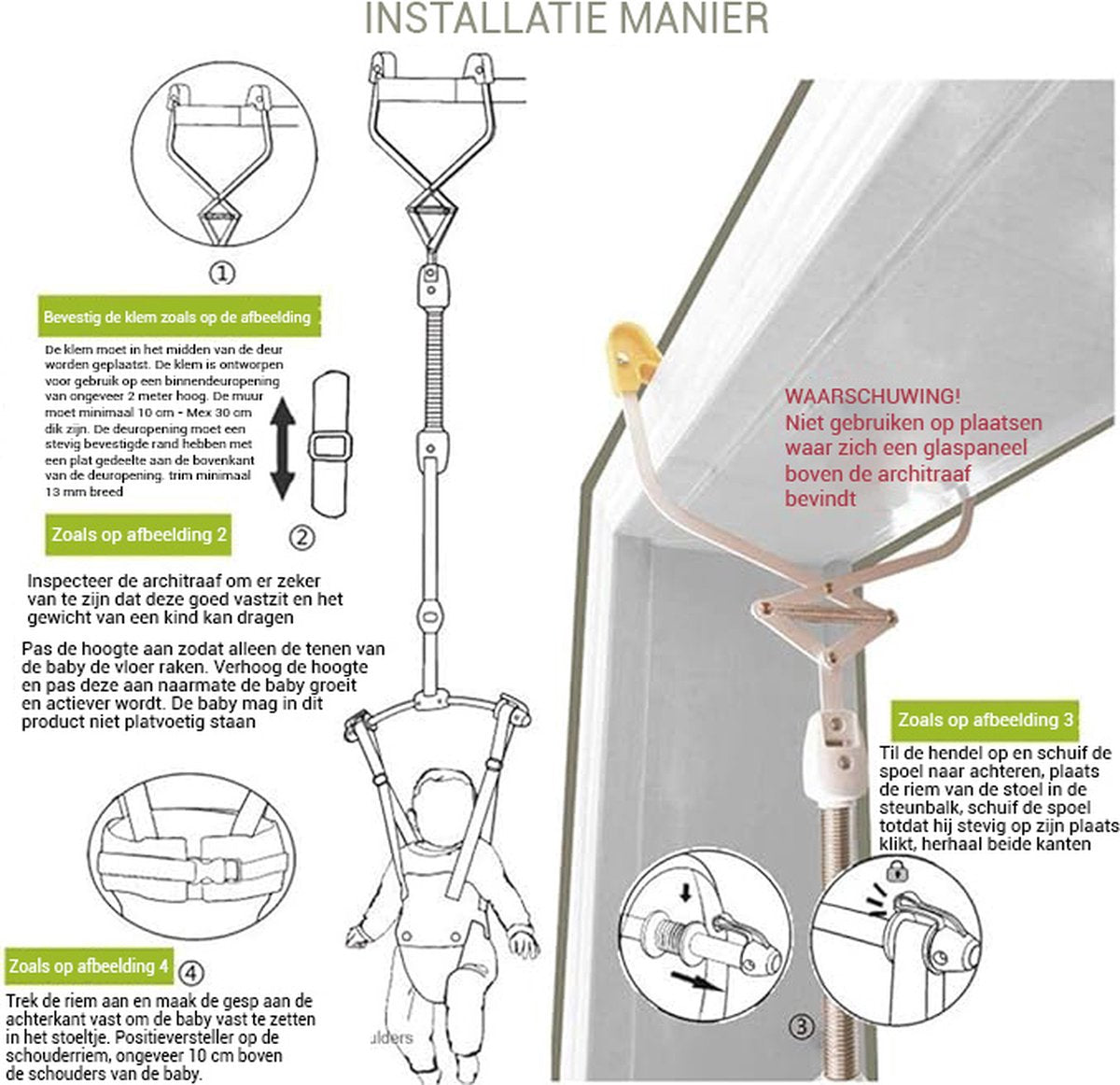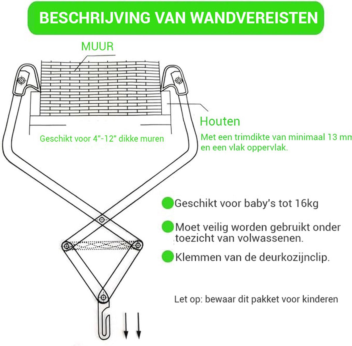 Veiligheid staat voorop, daarom voldoet onze set aan strenge veiligheidseisen. Alleen geschikt voor wanddiktes tussen 10 en 30 cm en met een sierdikte van minstens 13 mm, en ontworpen voor gebruik met geschikte deurkozijnen die de krachten van spelende kinderen kunnen weerstaan. Dankzij de verstelbare riem kan de hoogte worden aangepast aan de behoeften van je baby, waardoor alleen de tenen de grond kunnen raken voor extra veiligheid.