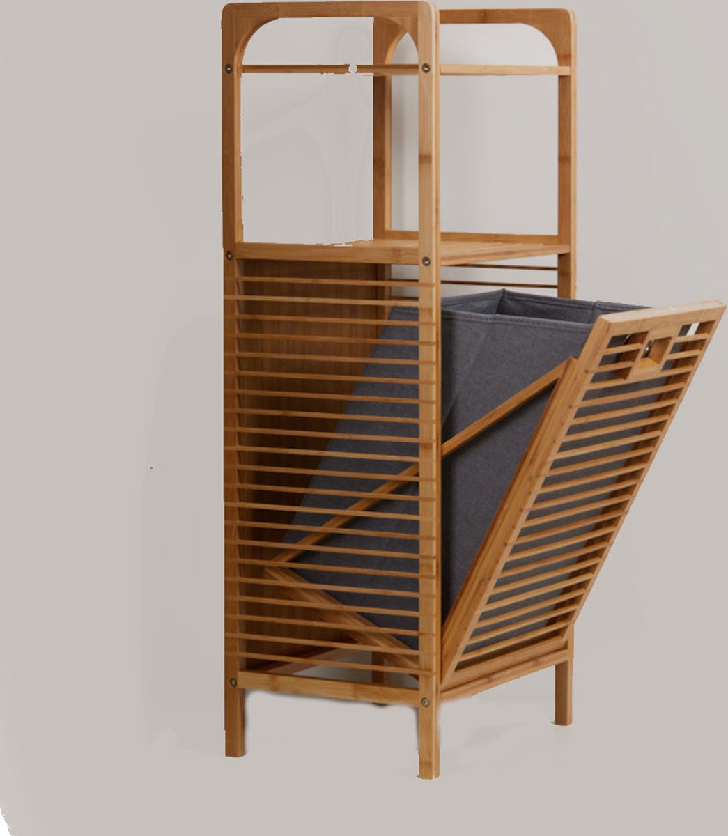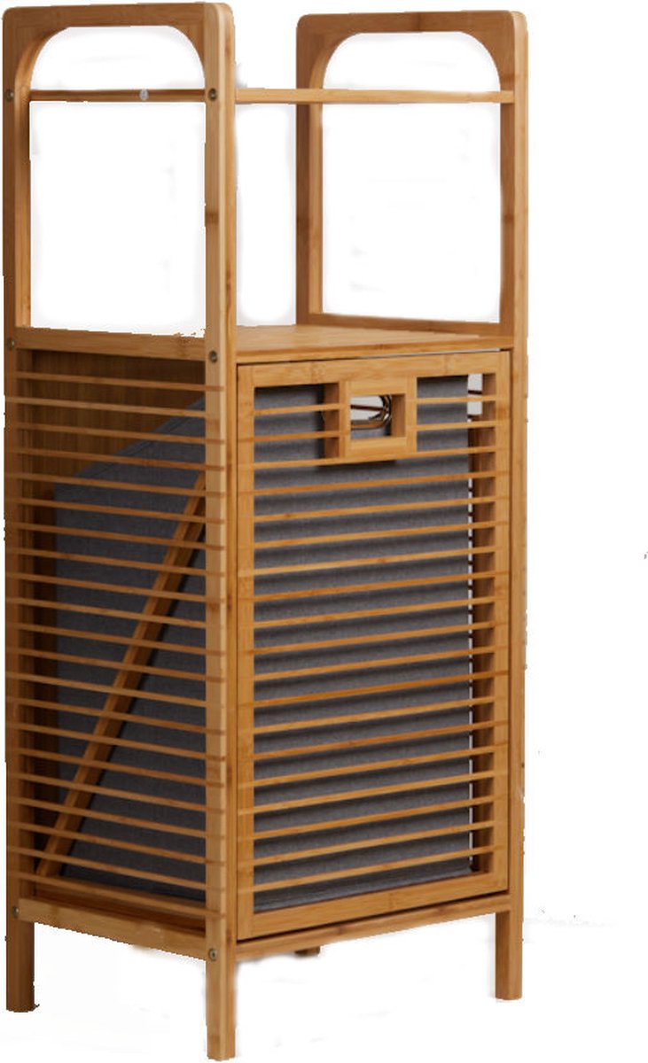 Badkamerrek van bamboe hout met ingebouwde wasmand en 2 legplanken. Speciaal gemaakt voor gebruik in de badkamer! Creeer zo direct extra opbergruimte.