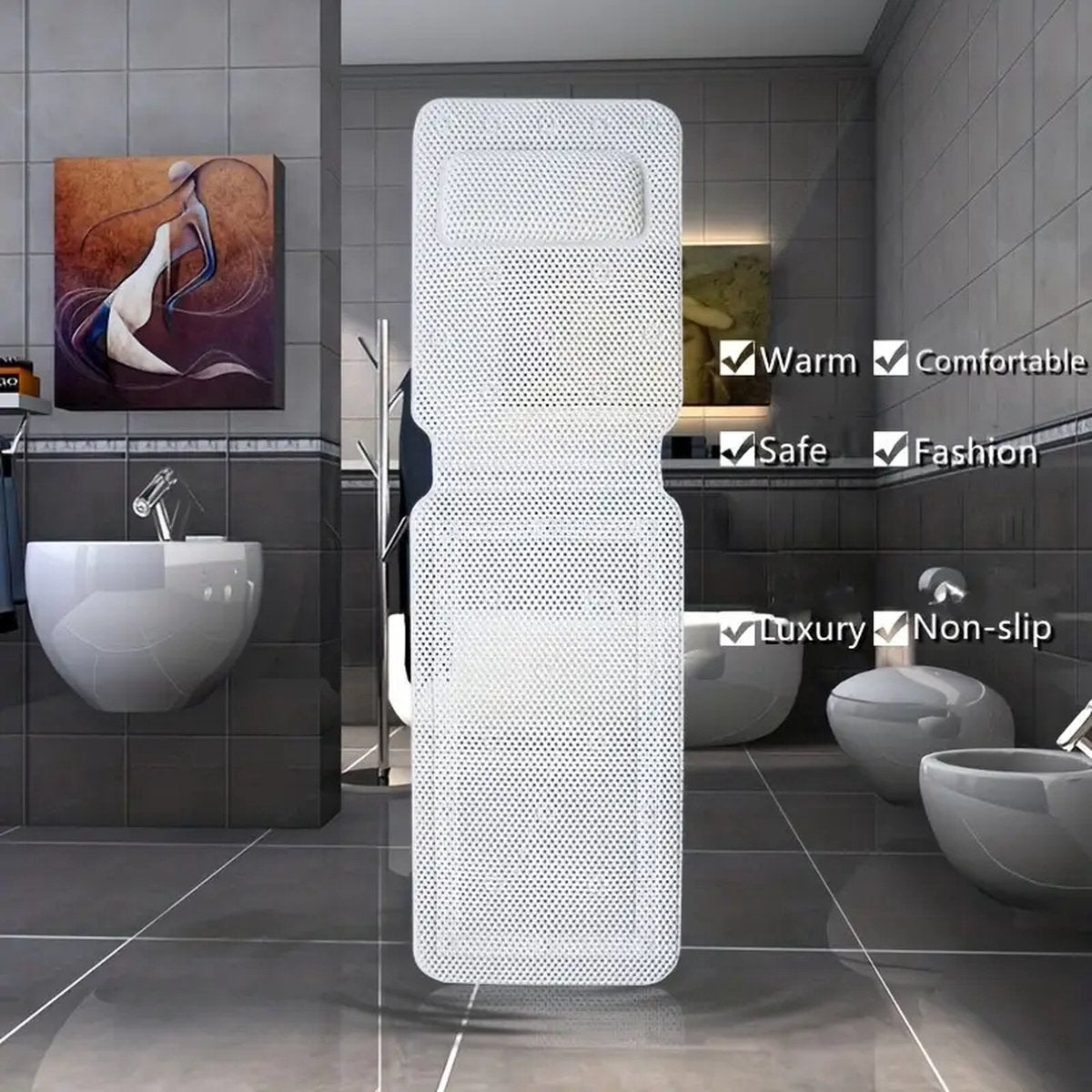 Voeg een vleugje elegantie en comfort toe aan uw badkamer met onze luxe witte badmat. Met zijn royale afmetingen van 125x36 cm biedt deze badmat uitzonderlijk comfort en veiligheid, ideaal voor elk badkamerinterieur.