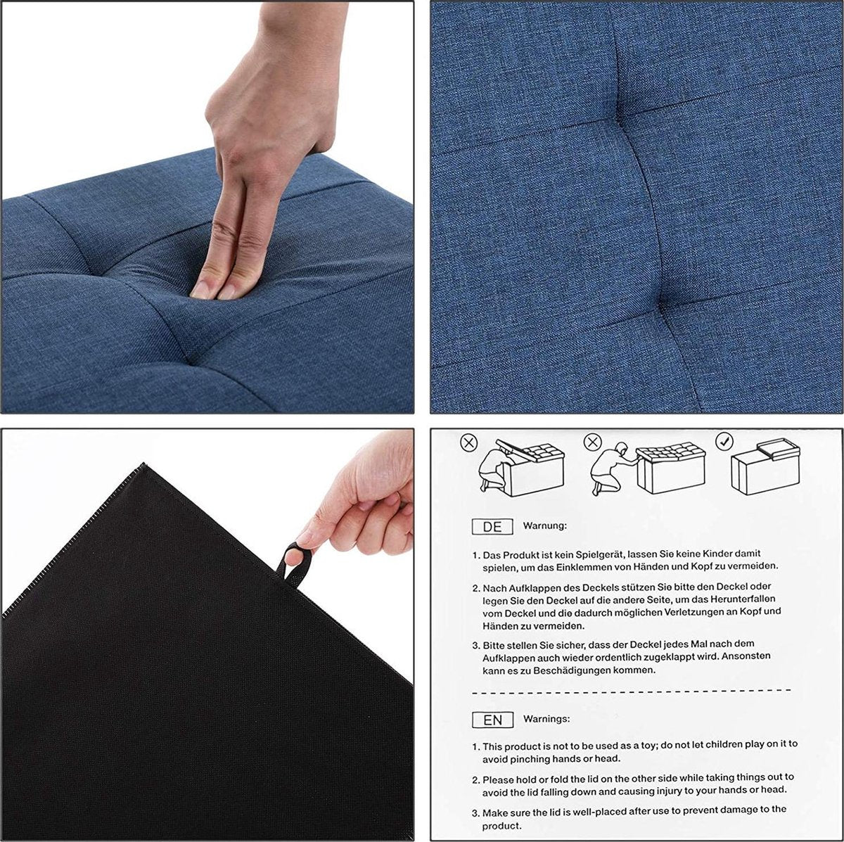 Plaats hem tegenover uw bank of plaats de comfortabele gestoffeerde meubelen aan het voeteneinde van uw bed en berg hier uw beddengoed of uw pyjama op. De stijlvolle box is gemakkelijk te openen, sluiten en op te vouwen. De MDF-constructie zorgt tevens voor een stabiel houvast, zodat twee personen tot 300 kg (statisch draagvermogen) tegelijk op de borst kunnen zitten.