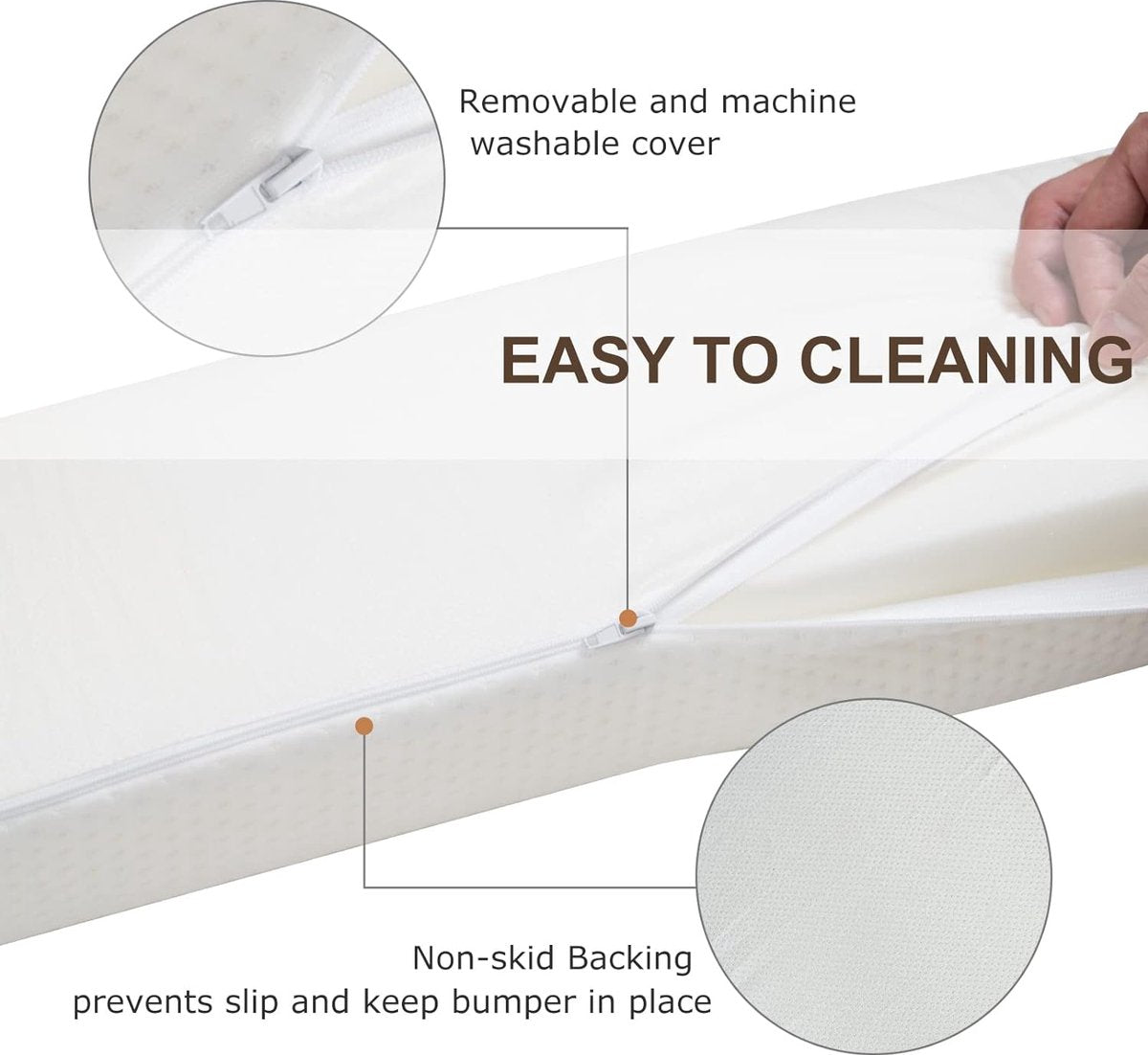 Nieuw concept van bedvakken: ben je bang dat je kind uit bed valt en ben je bang dat het typische metalen rooster hem niet in bed kan houden? En als je kind erg nieuwsgierig is om het traditionele rooster op het bed te beklimmen en te spelen, kan het een tweede schade veroorzaken als het rooster te hard is. In vergelijking met koude en harde metalen roosters geven onze kleine engeltjes er de voorkeur aan om met een warm en zacht beschermingsrooster te slapen. Eenvoudig te installeren: je hoeft slechts drie stappen te doen: 1. Open de vacuümverpakking en wacht tot het schuim terugveert (alleen bij het eerste gebruik). 2. Leg hem tussen het laken en de matras. 3. Het bed opnieuw bedekken. Ze zijn zo eenvoudig te monteren en te demonteren. Je kunt ze meenemen als je naar een andere plaats reist. Aan de boven- en onderkant van het bedhek bevindt zich een zacht, antislip rubber, zodat de lattenbodem niet wegglijdt. Betrouwbare partner 's nachts: het voorkomt niet alleen dat kinderen zich uit bed rollen, maar geeft ze ook een gevoel van veiligheid. Het geeft ze een gevoel van nabijheid. Het zal je verrassen dat het kind snel in slaap valt. Het maakt de overgang van het kind uit het kinderbed veel comfortabeler en behaaglijker. De vulling bestaat uit composietschuim met hoge dichtheid, dat na 3 maanden compressie 100% terugveert. Constructie van doordacht: het is groot genoeg (132 x 16,5 x 11,5 cm) om te voorkomen dat de kleine man wegrollt, maar niet te groot, deze hoogte voorkomt het risico op een val.