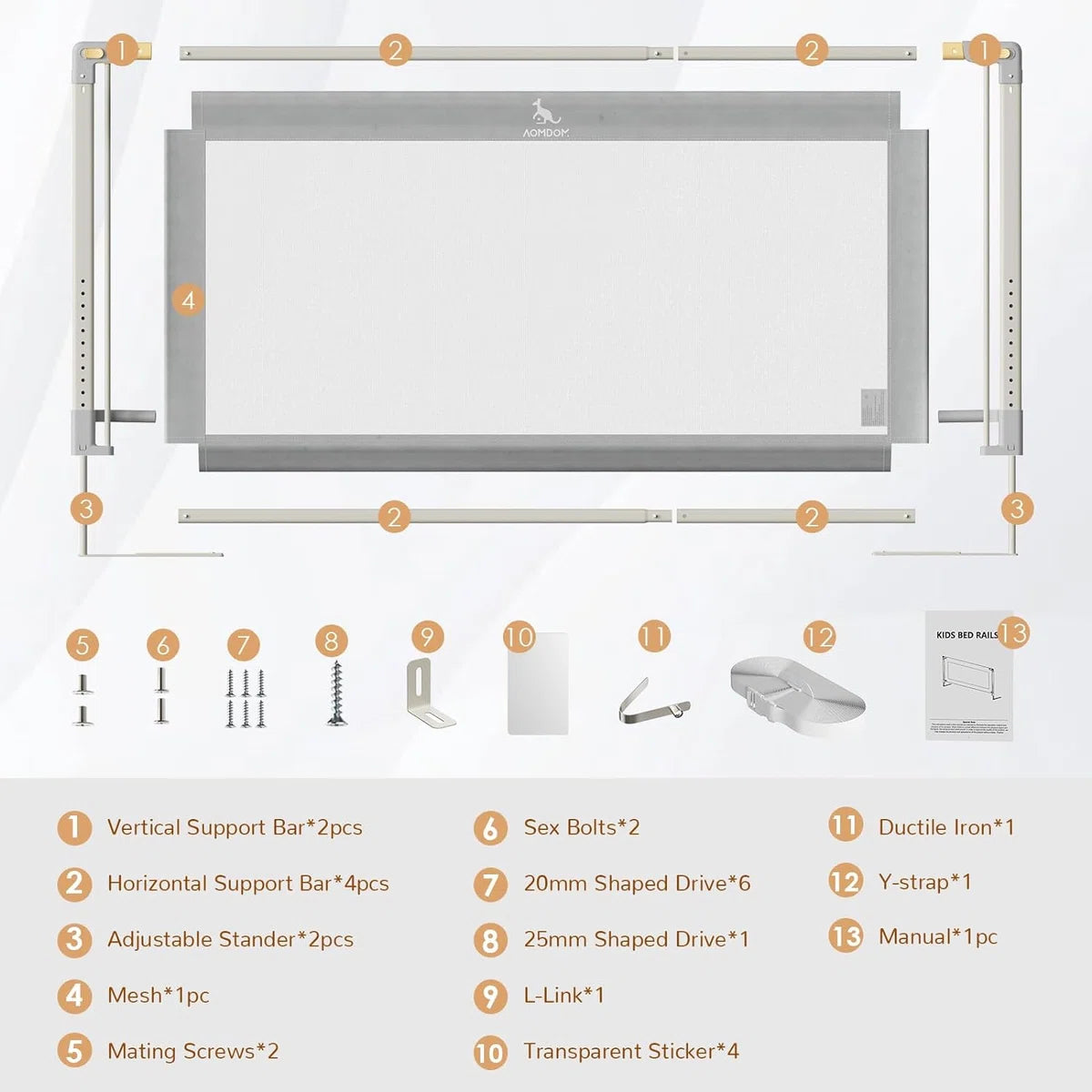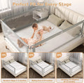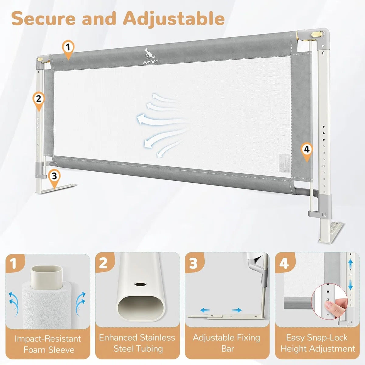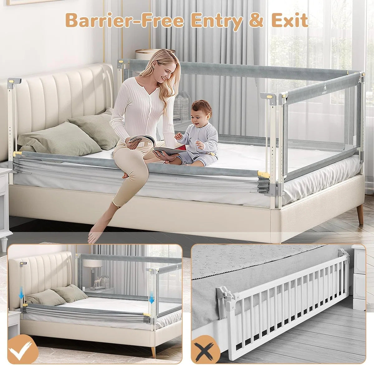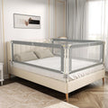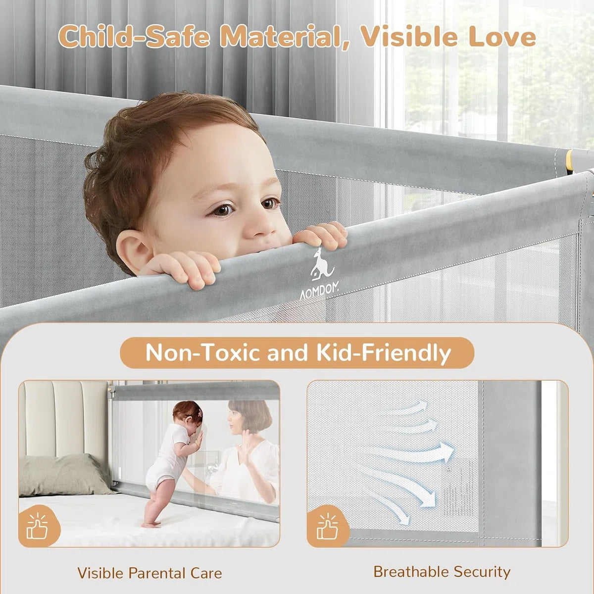 Bedhekje voor peuters: ons CE-geteste bedhekje is verkrijgbaar in 5 maten (134 cm) en past op de meeste bedden. Het is een betrouwbare metgezel voor peuters en een nuttig hulpmiddel voor ouders. Het bestaat uit staal en ademend net en voorkomt dat baby's uit bed rollen en maakt een eenvoudige bewaking door de verzorgers mogelijk. In hoogte verstelbaar en naadloos design: met 11 verstelbare hoogteposities van 71 tot 91 cm past ons bedhekje voor peuters zich aan verschillende matrasdiktes aan. De onderste dwarsbalk fixeert de matras stevig en creëert zo een naadloze verbinding tussen de leuning en de matras. Daardoor wordt de veiligheid van de baby gegarandeerd door te voorkomen dat hij met het hoofd of de handen en voeten blijft hangen. Zacht verticaal optillen: ons bedhek voor peuters is uniek uitgerust met een eenzijdige verlagfunctie. Met slechts één hand kunnen moeders en vaders de gespen gemakkelijk naar buiten trekken om elke kant onafhankelijk van elkaar te laten zakken, zelfs als ze hun baby vasthouden. Het dubbele gespsysteem voorkomt onbedoelde bediening en zorgt zo voor extra veiligheid. Stevig en veilig materiaal: onze bedhekken bestaan uit een sterk stalen frame voor buitengewone stabiliteit en . Het ademende mesh-weefsel bevordert de luchtcirculatie en zorgt ervoor dat kleine kinderen zich tijdens het slapen goed voelen, terwijl het tegelijkertijd het zicht voor de ouders verbetert. Voor extra bescherming hebben wij de horizontale stang voorzien van een schokbestendige schuimvulling.