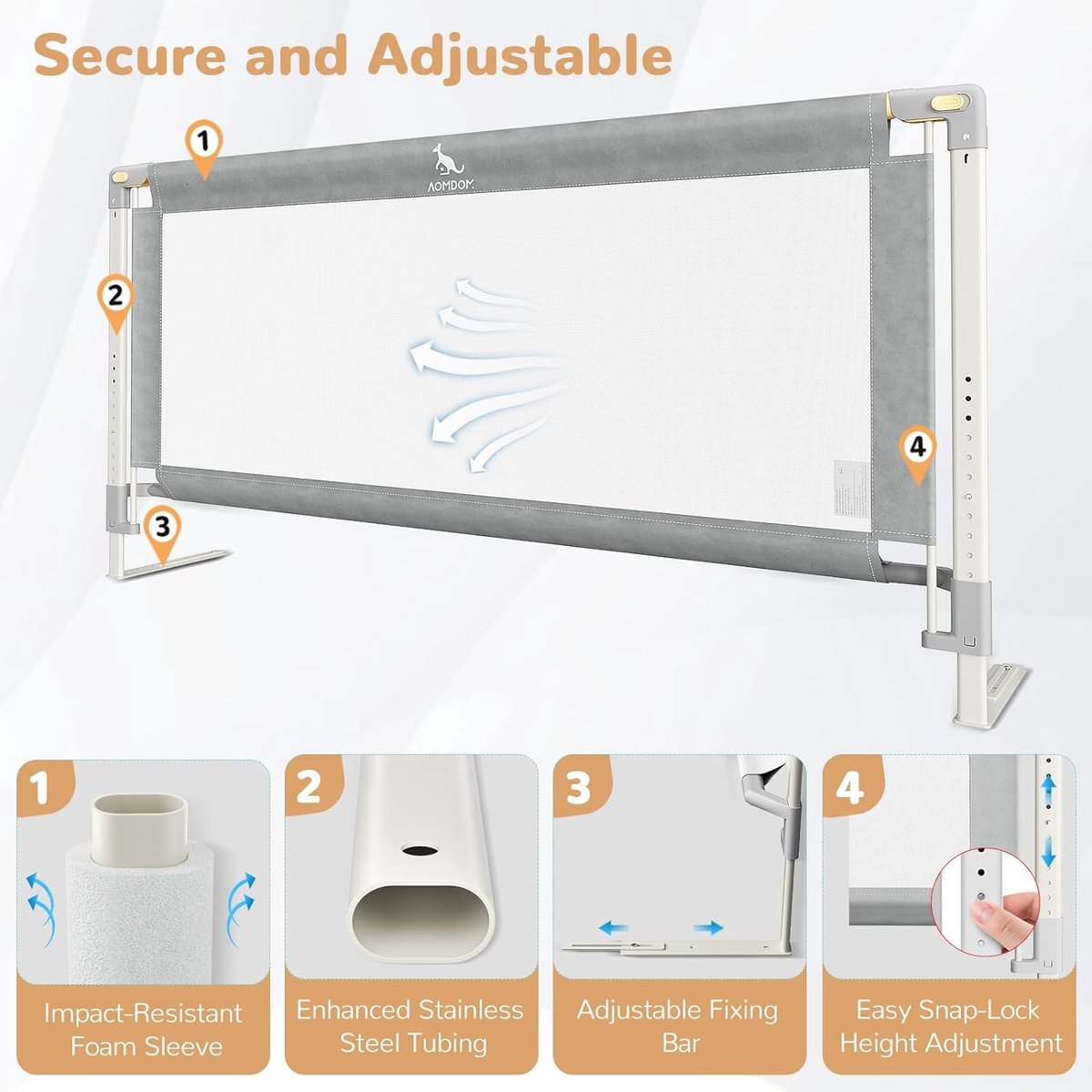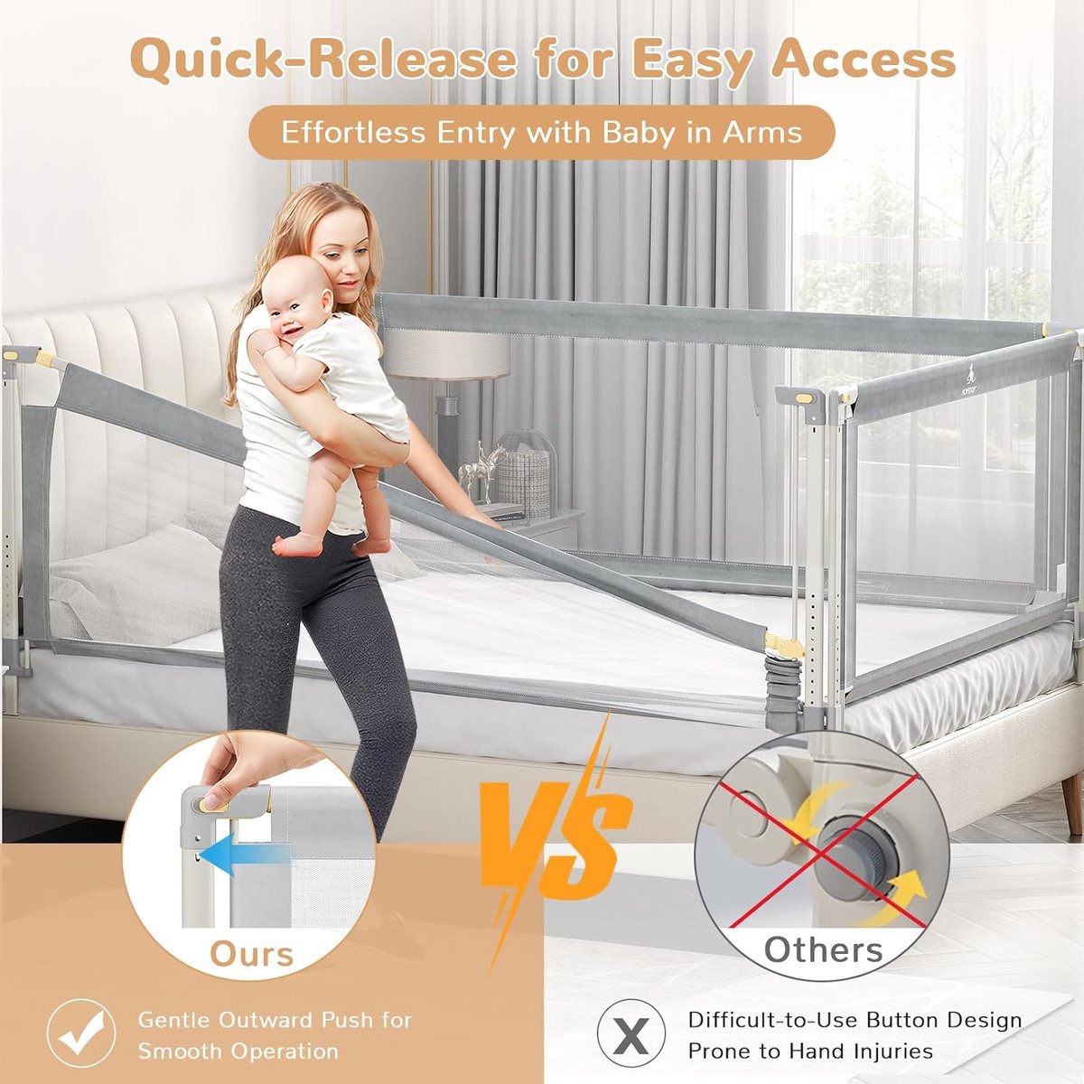 Bedhekje voor peuters: ons CE-geteste bedhekje is verkrijgbaar in 5 maten (134 cm) en past op de meeste bedden. Het is een betrouwbare metgezel voor peuters en een nuttig hulpmiddel voor ouders. Het bestaat uit staal en ademend net en voorkomt dat baby's uit bed rollen en maakt een eenvoudige bewaking door de verzorgers mogelijk. In hoogte verstelbaar en naadloos design: met 11 verstelbare hoogteposities van 71 tot 91 cm past ons bedhekje voor peuters zich aan verschillende matrasdiktes aan. De onderste dwarsbalk fixeert de matras stevig en creëert zo een naadloze verbinding tussen de leuning en de matras. Daardoor wordt de veiligheid van de baby gegarandeerd door te voorkomen dat hij met het hoofd of de handen en voeten blijft hangen. Zacht verticaal optillen: ons bedhek voor peuters is uniek uitgerust met een eenzijdige verlagfunctie. Met slechts één hand kunnen moeders en vaders de gespen gemakkelijk naar buiten trekken om elke kant onafhankelijk van elkaar te laten zakken, zelfs als ze hun baby vasthouden. Het dubbele gespsysteem voorkomt onbedoelde bediening en zorgt zo voor extra veiligheid. Stevig en veilig materiaal: onze bedhekken bestaan uit een sterk stalen frame voor buitengewone stabiliteit en . Het ademende mesh-weefsel bevordert de luchtcirculatie en zorgt ervoor dat kleine kinderen zich tijdens het slapen goed voelen, terwijl het tegelijkertijd het zicht voor de ouders verbetert. Voor extra bescherming hebben wij de horizontale stang voorzien van een schokbestendige schuimvulling.