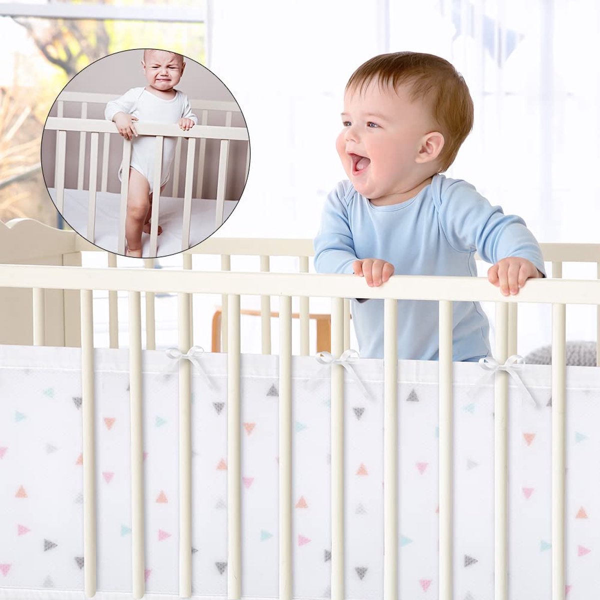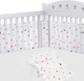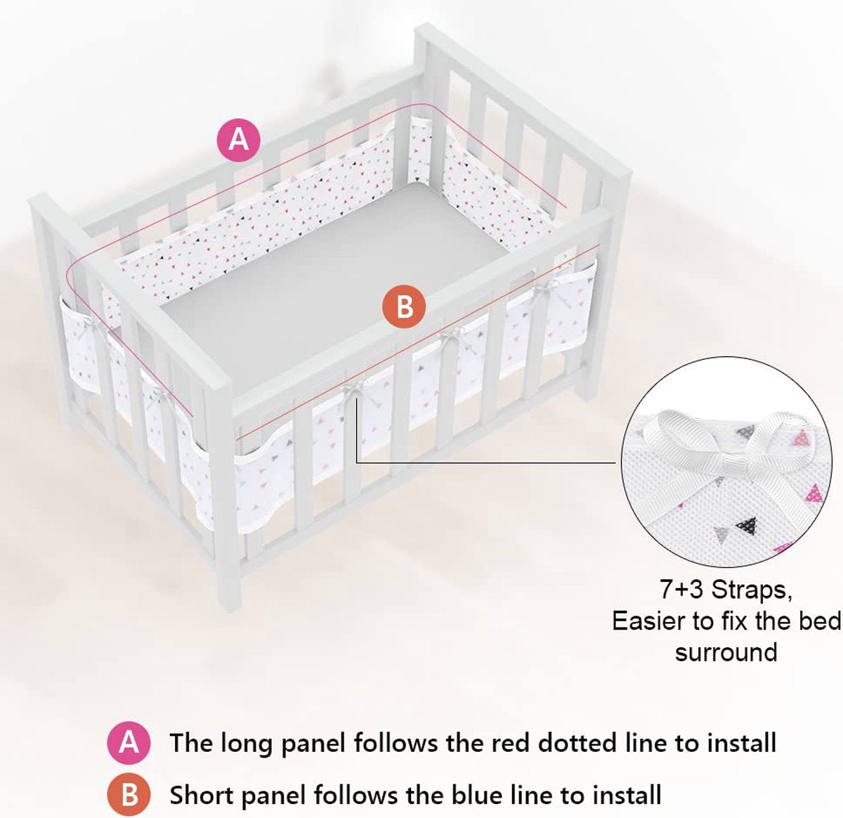 Premium materiaal: onze voering van hoogwaardige polyesterstoffen heeft een goed ademend vermogen, net babybednestje, dat de veiligheid van het kinderbed verbetert en tegelijkertijd het comfort van de baby garandeert. Vermindert het risico op verstikking, verstrikking en klimmen. Eenvoudig te installeren: de complete babybedomrandingen hebben 2 afneembare panelen, 340 cm x 30 cm (7 vaste posities) en 160 cm x 30 cm (3 vaste posities). Deze riemen maken de ademende bumper perfect voor alle 4 zijden van een standaard bedje, eenvoudig te bevestigen. Veilig slapen: de omrandingen van het babybed zijn gevuld met zeer dichte microvezel, de gezellige stootbescherming beschermt pasgeborenen tegen stoten tegen harde bedstutten en onaangename tocht. Het kind kan de benen tussen de stangen niet meer samendrukken. Het zorgt voor psychologisch comfort, een gezonde slaap en een veilig spel voor je baby. Gemakkelijk te reinigen: de hoofdomranding van het babybed is gemakkelijk te demonteren, machinewasbaar, krimpt niet en vervaagt niet. Het is beter als je het in een wasnet legt. Het zal de levensduur verlengen en het wassen vergemakkelijken. Ideaal cadeau: het babynestje is niet alleen geschikt als bedomranding voor baby's, maar ook als decoratie voor de kinderkamer, versier de kinderkamer, de bescherming is ideaal als cadeau voor een babyshower, doop of verjaardag.