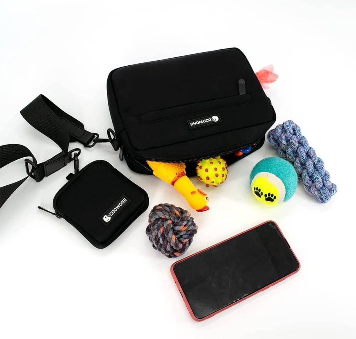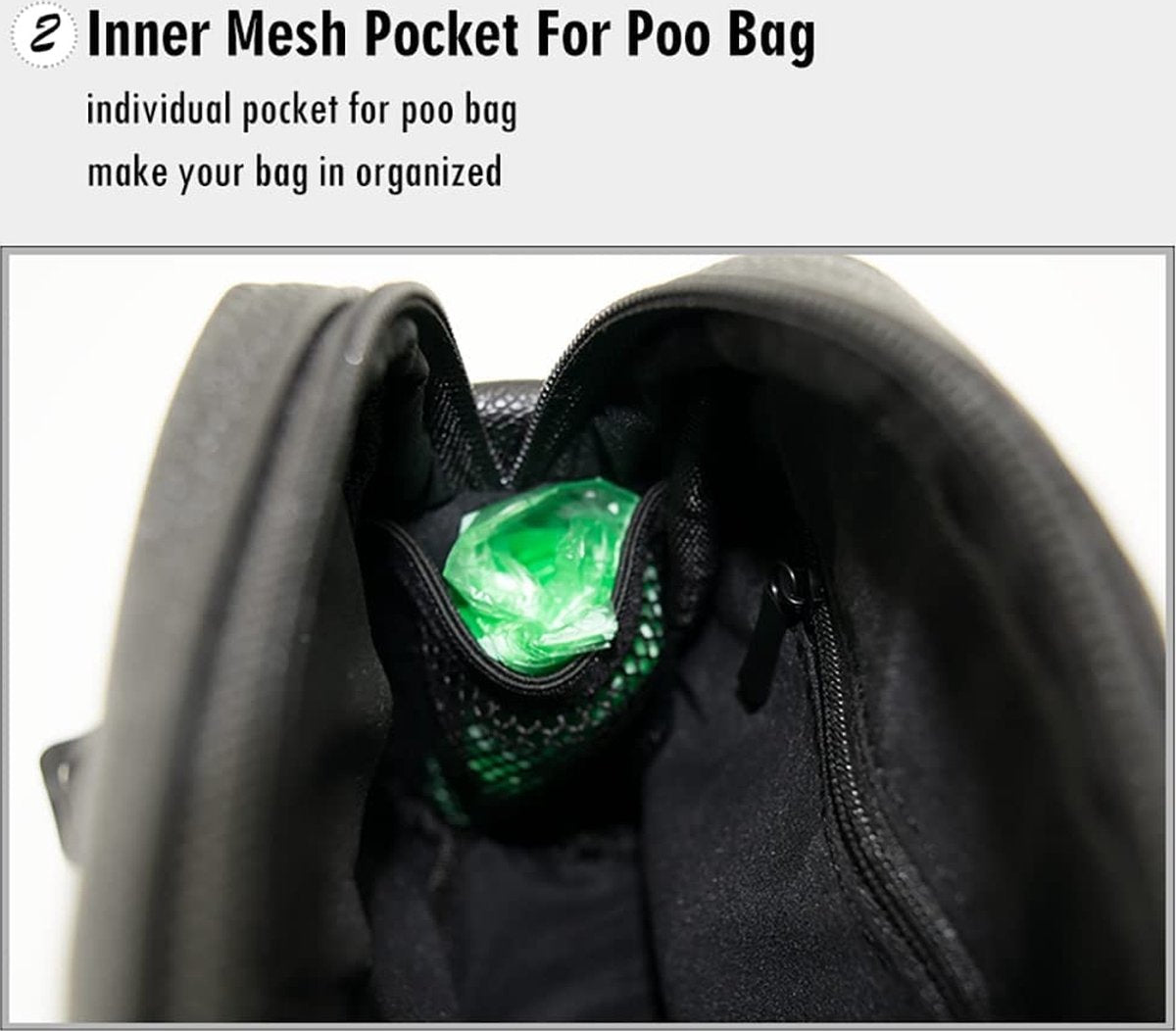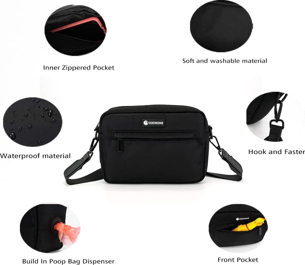 Dit beloningstasje heeft een groot hoofdvak en een binnenvak met ritssluiting, waar je traktaties van je hond in kan doen. In het voorvak ook met ritssluiting kun je persoonlijke spullen in doen zoals sleutels, portemonnee. De tas is ook waterdicht dus handig voor als het regent en het is vlekbestendig materiaal. Het tasje is gemaakt van duurzaam polyester. In het tasje zit ook een apart vakje voor poepzakjes in te doen zodat er altijd een zakje aanwezig is.