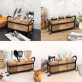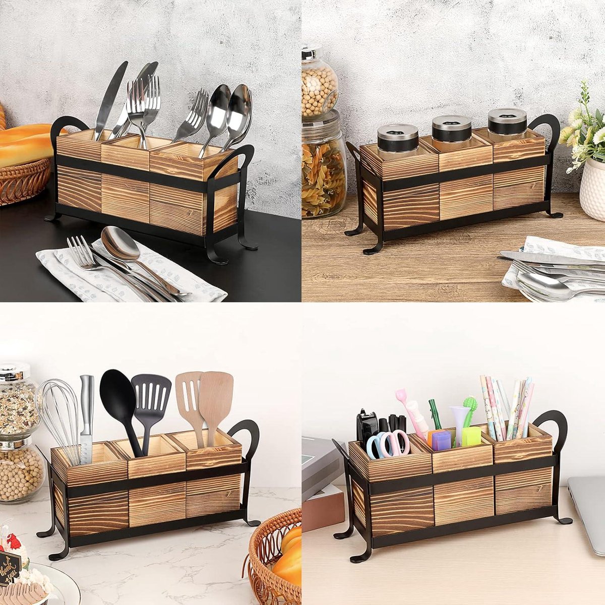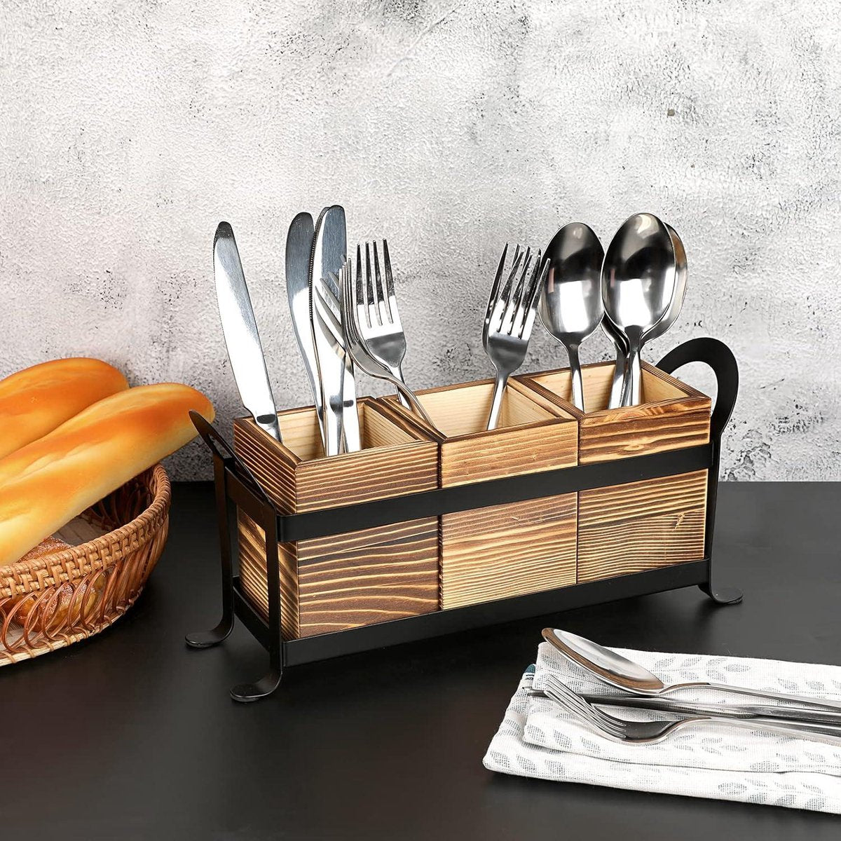 Bestekhouder Caddy met Metalen Lade - 3 Compartiment Organisator voor Keuken Aanrecht - Multifunctionele Houten Opbergdoos