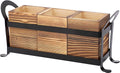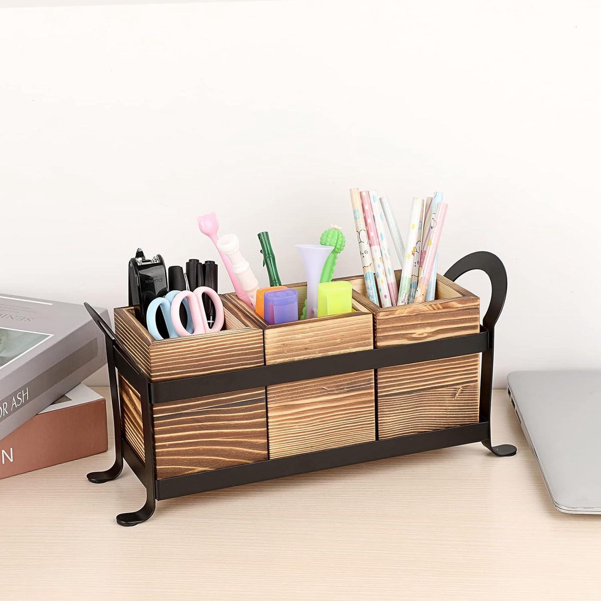 Dit houten houdersysteem voor gebruiksvoorwerpen bestaat uit 3 houten kisten gecombineerd met een metalen basis. De houten containers zijn gemaakt van bamboe, wat zorgt voor een stevig en kwalitatief gevoel. De metalen basis kan 3 dozen stevig vasthouden en beschermt ze tegen vocht, terwijl de handvatten aan beide zijden het gemakkelijk maken om de set op te tillen. Bovendien voorkomen de gewatteerde voetjes krassen op het oppervlak waarop het geplaatst wordt.
