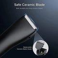 2. Hoogwaardige Bladen: Uitgerust met zachte keramische bladen en roestvrij staal, biedt deze trimmer ultiem comfort en gemak. Het waterdichte ontwerp zorgt ervoor dat je je geen zorgen hoeft te maken over waterspatten.
