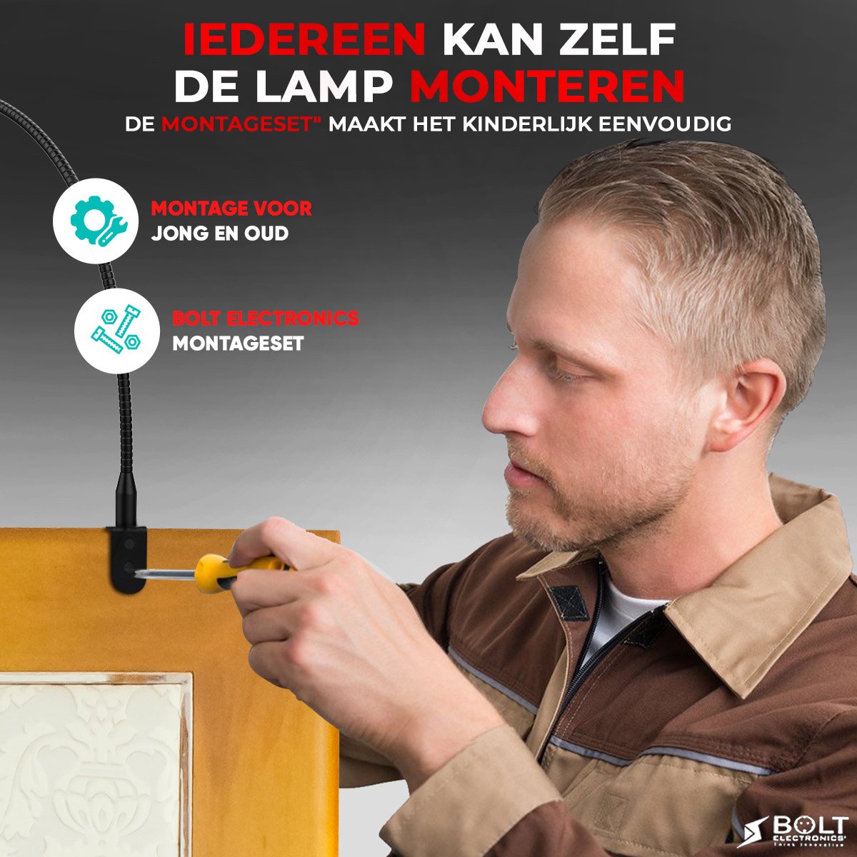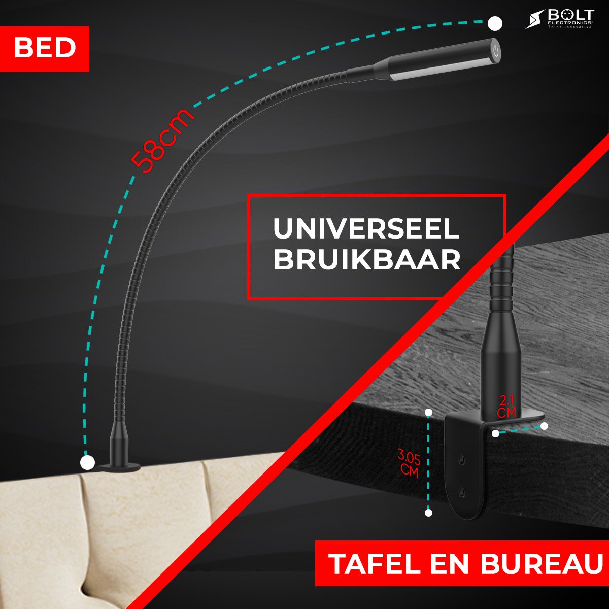 Ben je op zoek naar een hoogwaardige leeslampje die je gemakkelijk en snel op ieder hoofdbord van een boxspring of bed kan bevestigen? Dan heb je gevonden wat je zocht! De Bolt Electronics® leeslamp is voorzien van een flexibele arm en het heeft een slanke vormgeving, waardoor je de leeslamp eenvoudig in de gewenste positie kan plaatsen.