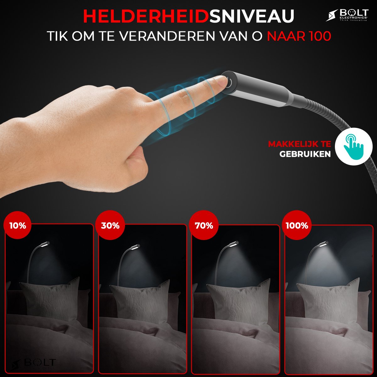 Bolt Electronics® 1011 LED Bed Leeslampje - Wandlamp met Dimfunctie – Hoofdbord Leeslamp – Bureaulamp - 2700K Warm Wit - Aluminium - Zwart