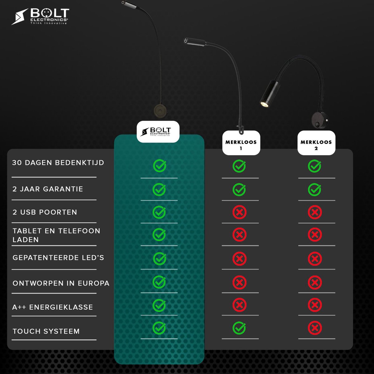 Bolt Electronics® BLLIQ2011 Leeslamp 1 stuk – Bedlamp met 2 USB's - Nachtlampje voor Volwassenen - 59.50 CM - Wandlamp met Dimfunctie - Zwart - 230 V