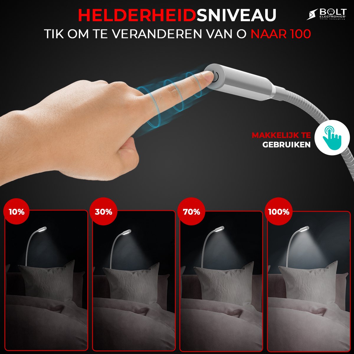 Deze Bolt Electronics® LED bedlampjes hoofdbord - aluminium - flexibele arm - dimbaar - leeslamp zijn eenvoudig te monteren, vriendelijk in gebruik en beschikken over een fijn warm wit licht. Door het stijlvolle design van deze leeslampjes en de gebruiksvriendelijke dim- en buigoptie zijn deze bedlampen een perfecte toevoeging aan uw slaapkamer. Door middel van een touch knop op de lampjes zijn de bedlampjes eenvoudig te dimmen met een zachte fade-in of fade-out. De nachtlampen worden geleverd in een set van twee inclusief adapter en een 400cm aansluitsnoer.