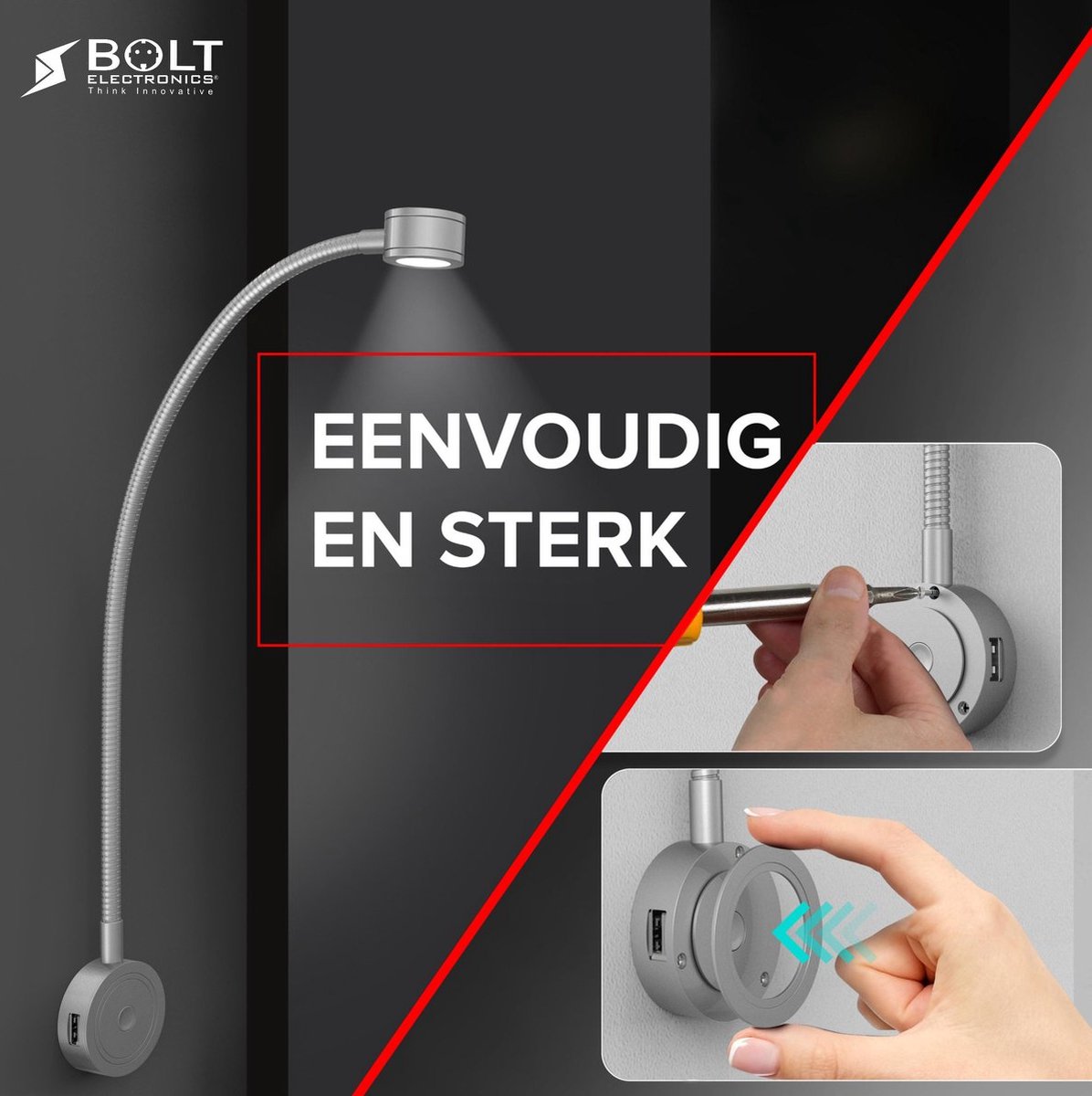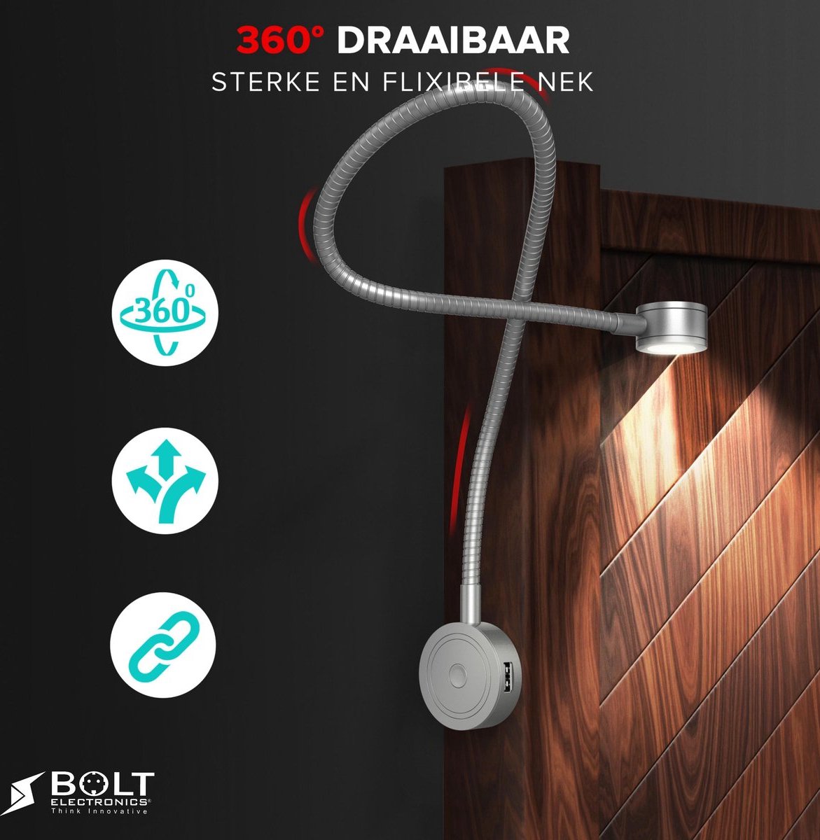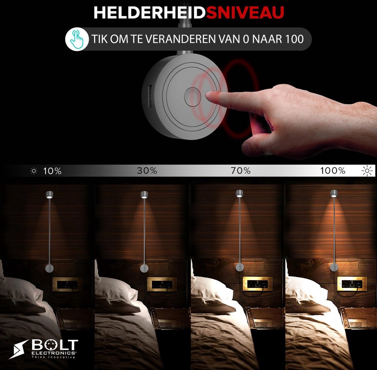Bolt Electronics® Leeslamp 1 stuk – Bedlamp met 2 USB's - Warm licht - Nachtlampje voor Volwassenen - Wandlamp met Dim-functie - Modern ontwerp - Gemakkelijk in gebruik - Zilver