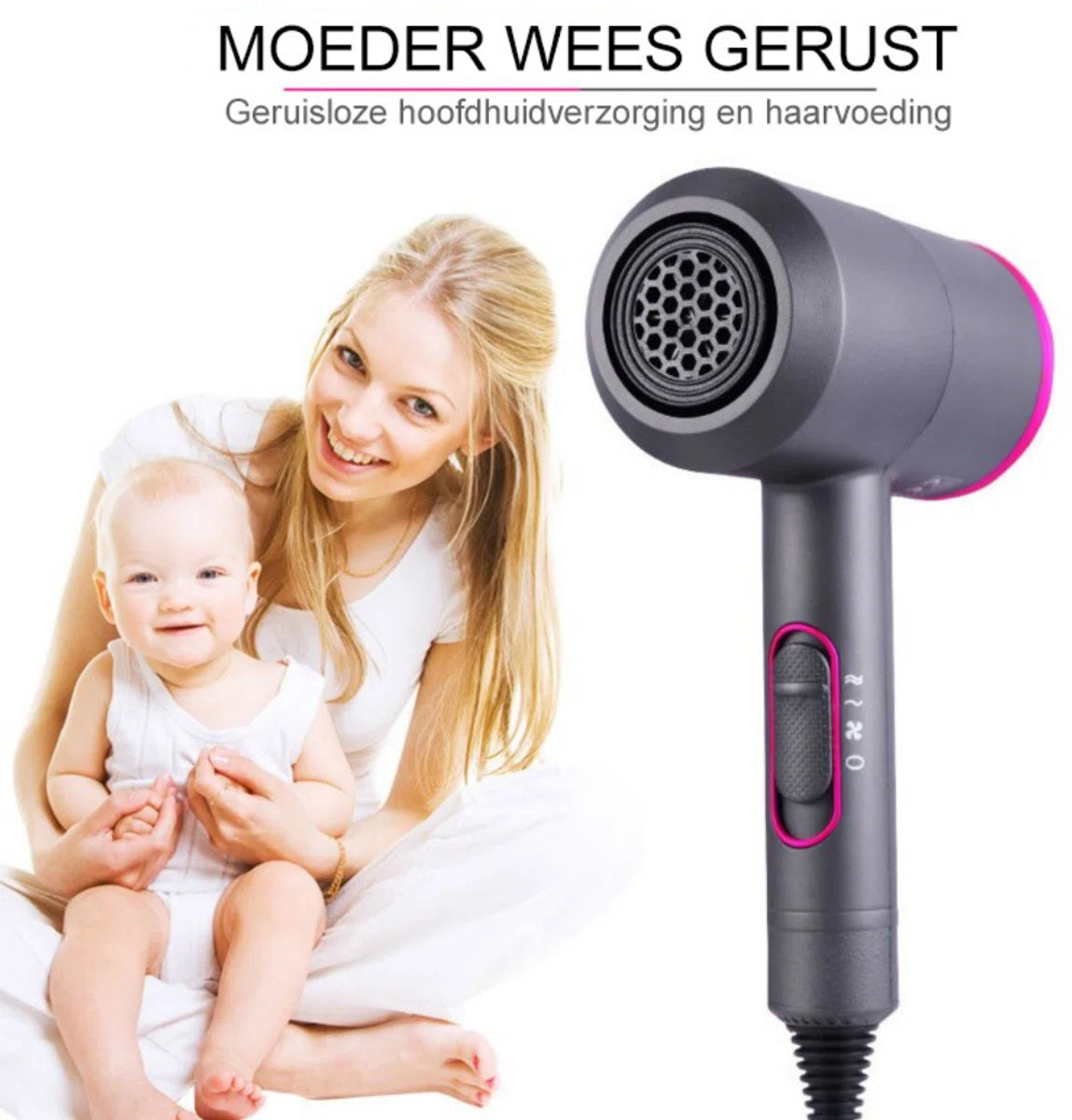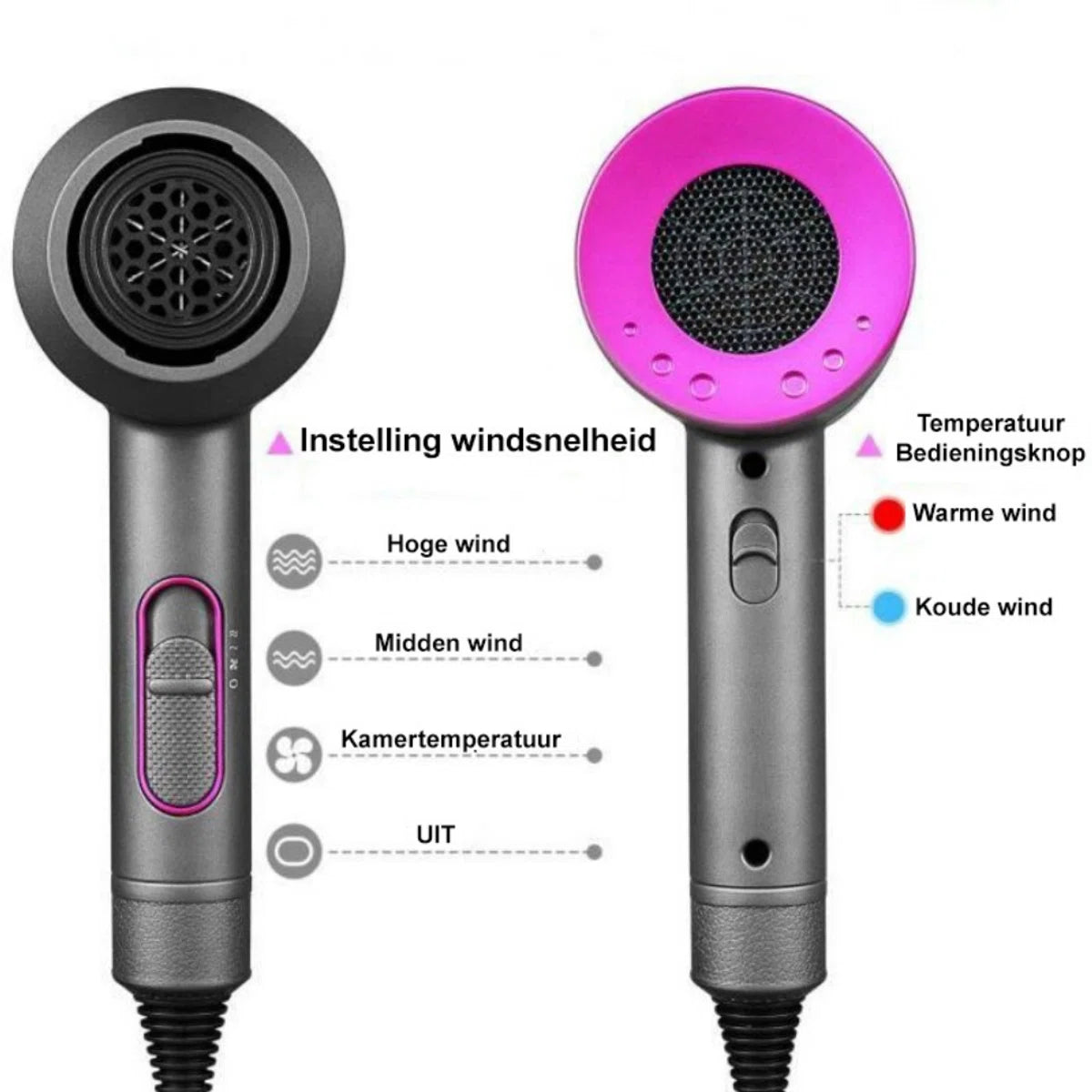 Je kan kiezen uit droge of warme wind. Binnen enkele minuten is je haar helemaal droog en heb je geen last van een bad hairday!