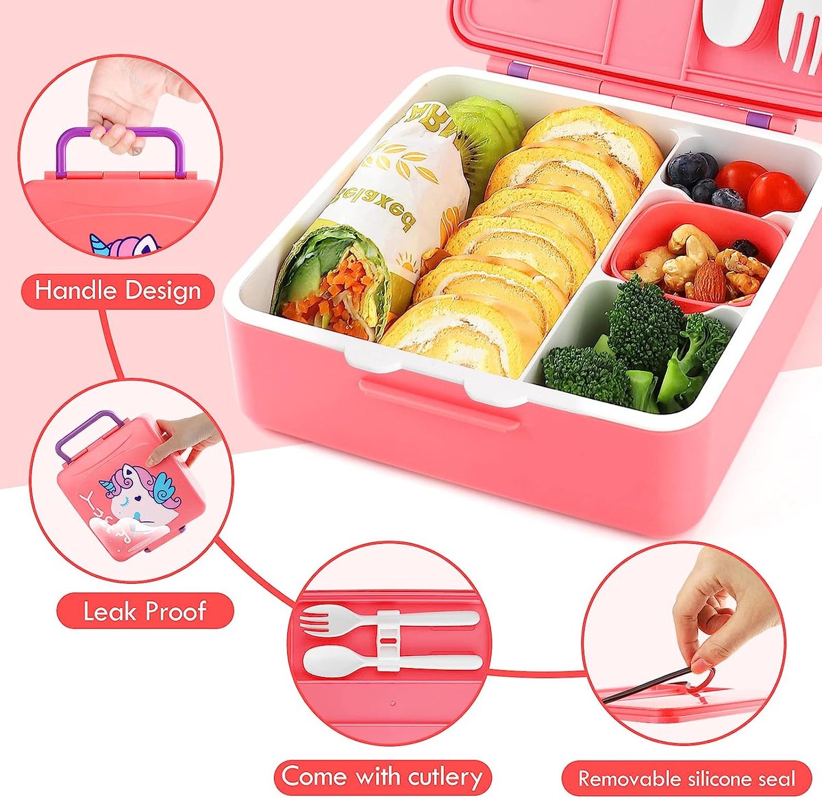 Broodtrommel voor kinderen, met 4 vakken, lepel en vork, 1300 ml, lunchbox voor kleuterschool, lekvrij, bento box voor meisjes, magnetronbestendig, met draaggreep, sausbakje (eenhoorn)