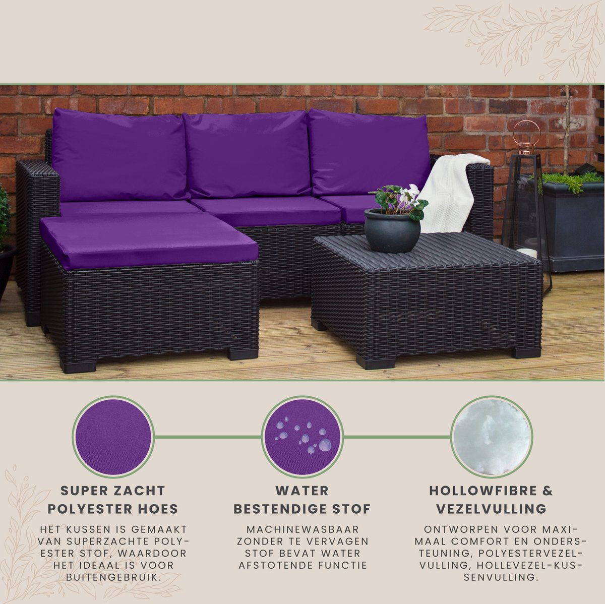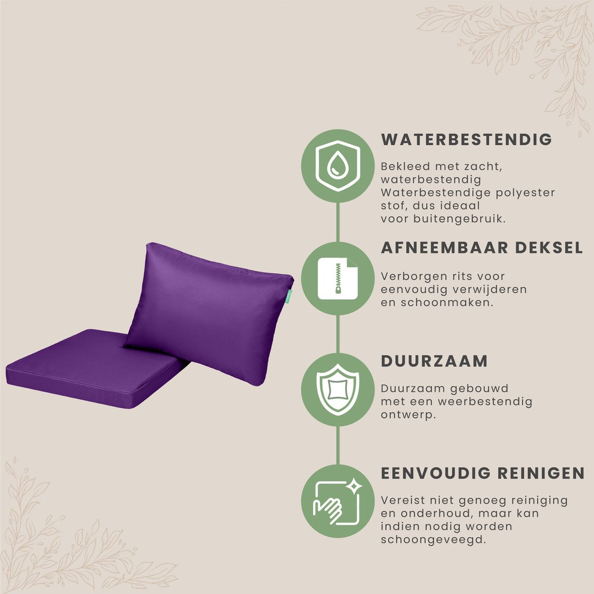 Onze zitkussens voor buiten zijn gemaakt van waterbestendig polyester en gevuld met polyestervezels voor ultiem comfort en ondersteuning. De rugkussens zijn gevuld met holle vezels voor extra zachtheid en duurzaamheid. De stof voelt zacht aan en is ontworpen om bestand te zijn tegen regelmatig gebruik, waardoor deze zitkussens de perfecte keuze zijn om de hele dag buiten te ontspannen. Bovendien beschermt het waterbestendige ontwerp tegen nat weer, zodat u van uw kussens kunt genieten.