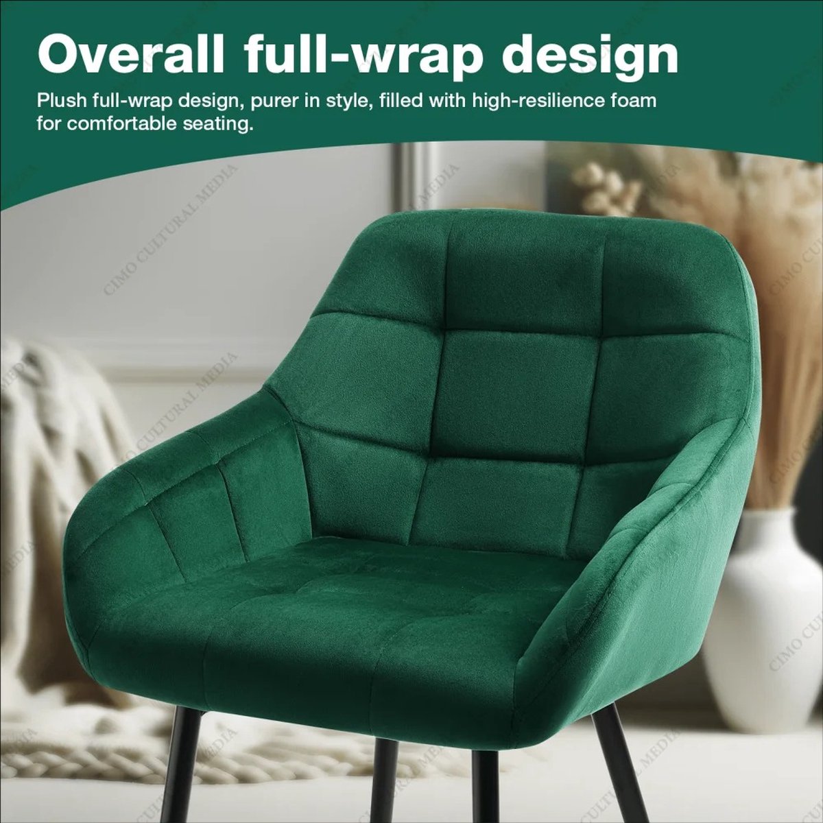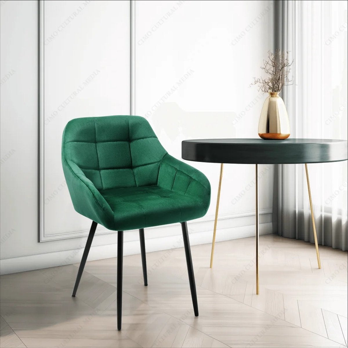 Elke stoel is zorgvuldig gestoffeerd met fluweel dat een rijke, luxe uitstraling geeft en tegelijkertijd zacht aanvoelt. De zwarte poten vormen een strak contrast met de groene bekleding en zorgen voor een stevige en stabiele basis. Het ergonomische ontwerp met armleuningen biedt extra ondersteuning, waardoor je urenlang comfortabel kunt zitten.