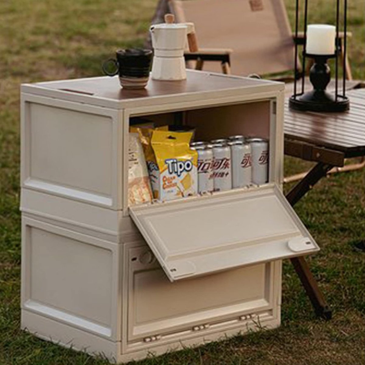 Opvouwbare outdoor campingtafel: afmetingen: 46,8 x 34,7 x 23 cm (l x b x h), volume: ca. 35 l, kleur: wit; ontwerp met vergrote capaciteit, kan alle soorten kampeeruitrusting opbergen, geen noodzaak om grote tassen en kleine tassen mee te nemen. Praktische opbergdoos: met multidirectionele schakelaar, bovenste houtnerf, kan gemakkelijk worden gedemonteerd en in meerdere lagen worden gestapeld; voor- en achterkant kunnen in beide richtingen worden geopend, ophalen is niet chaotisch. Ontwerp: geen vervorming en scheurvorming, duurzaam, met wielen, gemakkelijk te verplaatsen, eenvoudig en arbeidsbesparend, stabiel en kantelt niet. Het deksel van de box is een houten plank, die als snijplank, dienblad en campingtafel kan worden gebruikt. Huis opbergdoos en auto-opbergdoos: je kunt kleding, kinderspeelgoed, kleine voorwerpen enz. thuis opbergen, als je naar buiten gaat, kun je ze gebruiken als boodschappendoos en opbergdoos en in de kofferbak van de auto leggen.