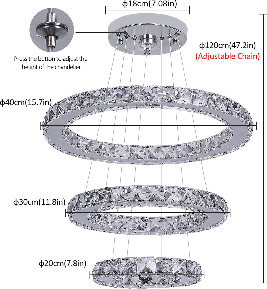 De afmetingen van de kroonluchter zijn zorgvuldig ontworpen voor een indrukwekkende uitstraling: de bovenste ring heeft een diameter van 40cm, de middelste ring 30cm, en de onderste ring 20 cm. Deze gelaagde opbouw geeft de lamp een dynamisch en elegant silhouet.