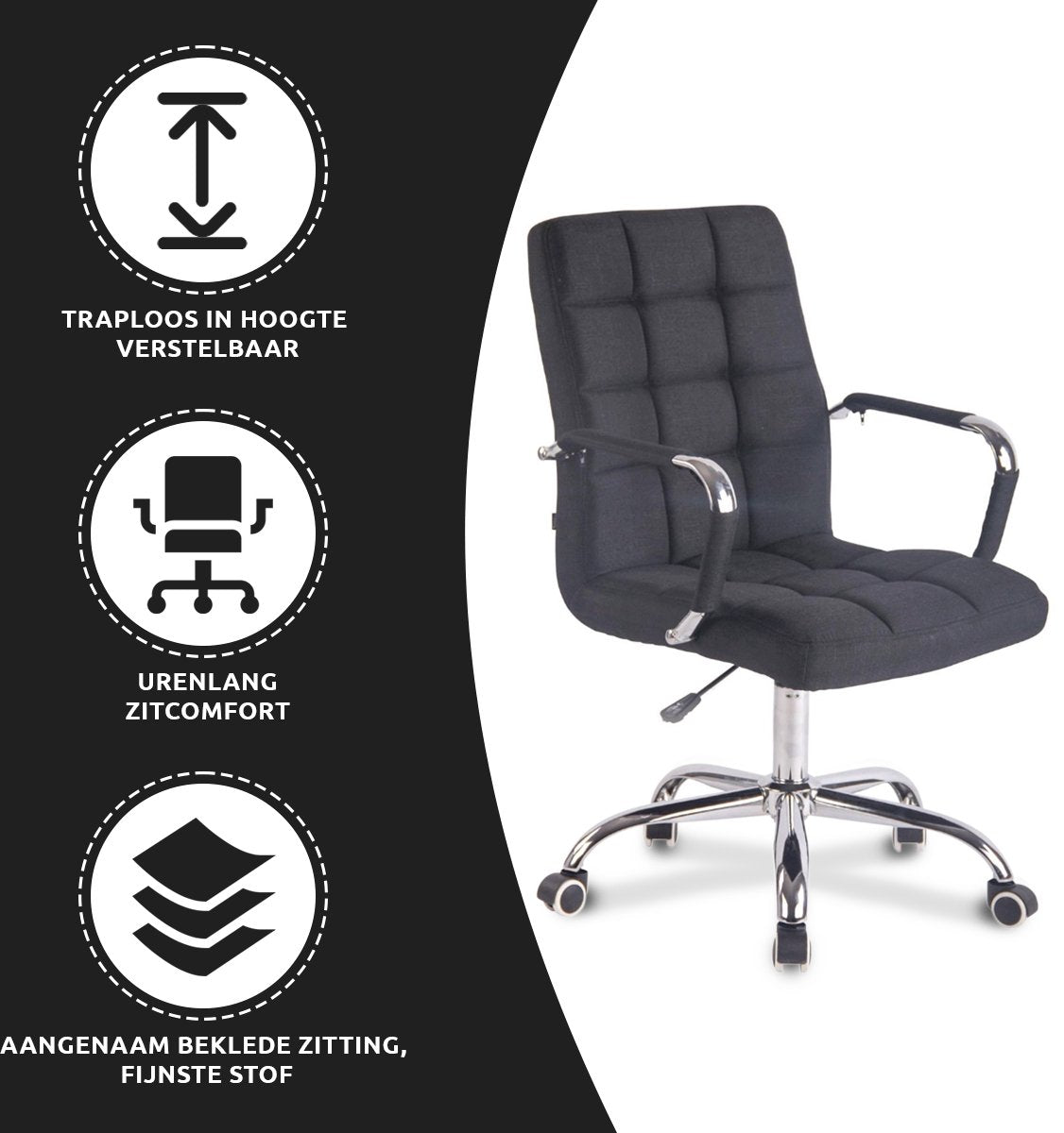 De Deli bureaustoel imponeert met zijn moderne design en biedt een hoog comfort tijdens het werken dankzij de rugleuning. Deze exclusieve Deli bureaustoel is gestoffeerd met een hoogwaardige bekleding. Dankzij de verstelbare zithoogte is ergonomisch zitten gegarandeerd. De zithoogte is traploos instelbaar met de hendel onder de zitting. De bureaustoel staat stevig op vijf soepel lopende wielen.
