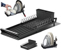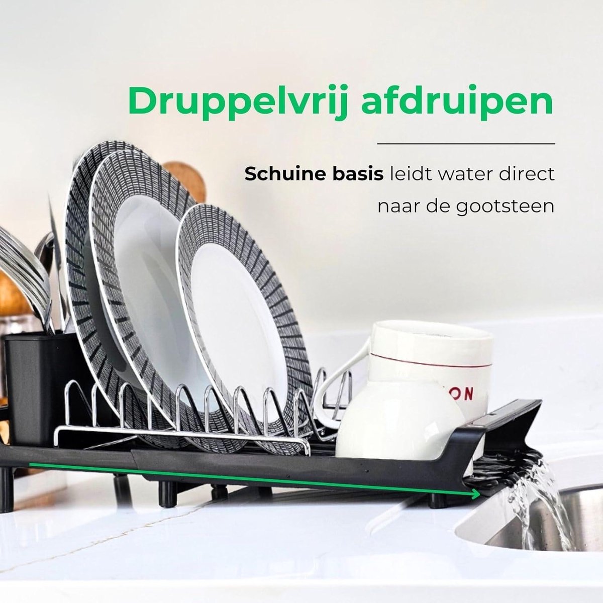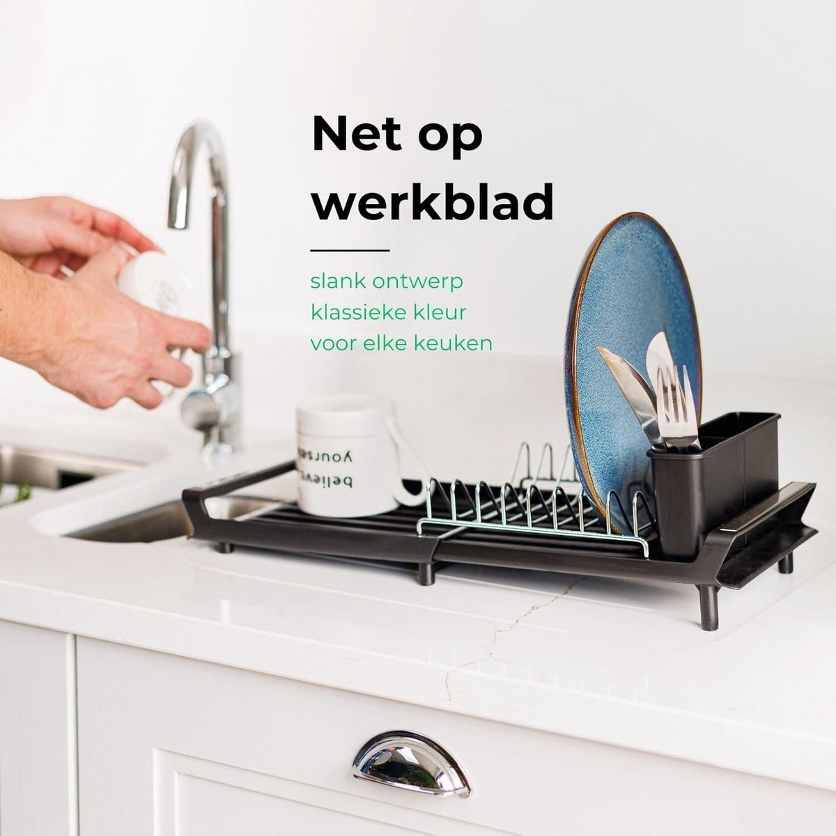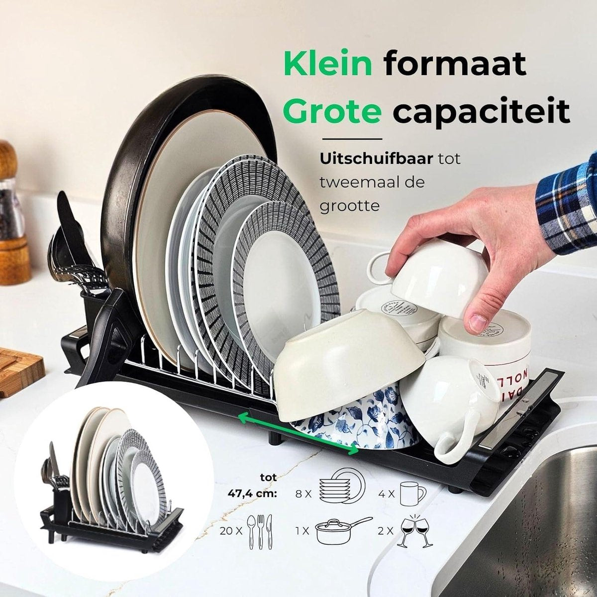 Compact Uitschuifbaar Afdruiprek Zwart - Klein Afwasrek met Lekbak - Gootsteen Verstelbaar Dish Drying Rack - Bestekhouder - Antislip Voeten - Anti-roestplaat - 28/47 x 20cm afdruiprek met lekbak inklapbaar