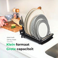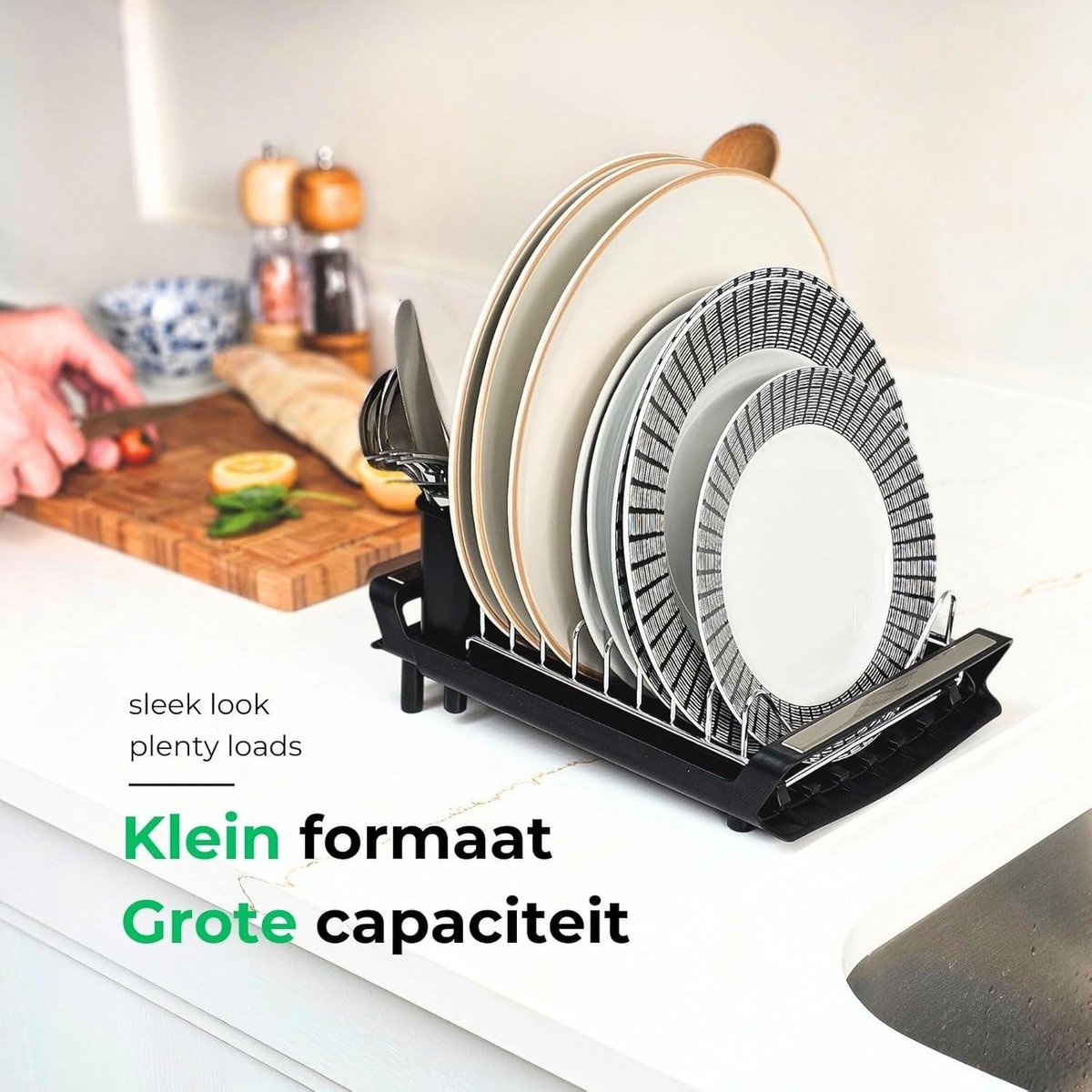 Dit compacte en uitschuifbare afwasrek is perfect voor kleine keukens. Met een stijlvolle zwarte afwerking is dit rek verstelbaar van 28 tot 47 x 20 cm, waardoor het gemakkelijk aan te passen is aan de beschikbare ruimte.