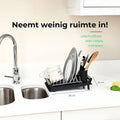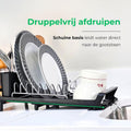 Met de lekbak die water naar de gootsteen afvoert, blijft je aanrecht droog en netjes. Daarnaast is dit rek voorzien van afneembare haken, waardoor je eenvoudig borden, bestek en meer kunt organiseren.
