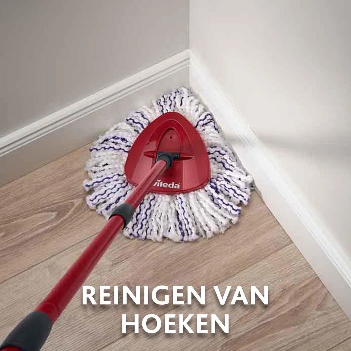 De Vileda Turbo 3in1 mop is de perfecte oplossing voor iedereen die op zoek is naar gemak en efficiëntie bij het schoonmaken van vloeren. Met zijn unieke pedaalaangedreven centrifugemechanisme kunt u de vochtigheidsgraad van de mop bepalen zonder uw handen nat te maken. Daarnaast houdt de antispatrand waterspatten binnen de emmer tijdens het centrifugeren.Deze mop maakt grondig schoon met behulp van miljoenen geavanceerde microvezels die al het vuil gemakkelijk opnemen, zelfs het meest hardnekkige, en dat alleen met water - geen agressieve chemische producten meer nodig! De franjes in microvezels zorgen ervoor dat de Vileda Turbo-mop meer dan 99% van de bacteriën verwijdert, waardoor uw vloeren hygiënisch schoon zijn.De machine wasbare franjekop zorgt ervoor dat u de kop van de mop eenvoudig kunt reinigen in de wasmachine op maximaal 30°C. Het wordt aanbevolen om de kop om de 6 maanden te vervangen voor de beste schoonmaakresultaten. Bovendien kunt u met de gepatenteerde driehoekige kop van de Turbo 3in1 zelfs moeilijk bereikbare plekjes schoonmaken, zoals hoeken, onder meubels, langs plinten en tussen tegels.Met een telescopische steel tot 123 cm kunt u comfortabel dweilen zonder te hoeven bukken. Dit maakt de Vileda Turbo 3in1 mop ideaal voor iedereen die op zoek is naar een effectieve en handige manier om vloeren schoon te maken.Productspecificaties: - Pedaalaangedreven centrifugemechanisme - Antispatrand - Microvezel kop - Verwijdert meer dan 99% van de bacteriën met enkel water - Machine wasbare franjekop - Telescopische steel tot 123 cm - Gepatenteerde driehoekige kop voor moeilijk bereikbare plekjes