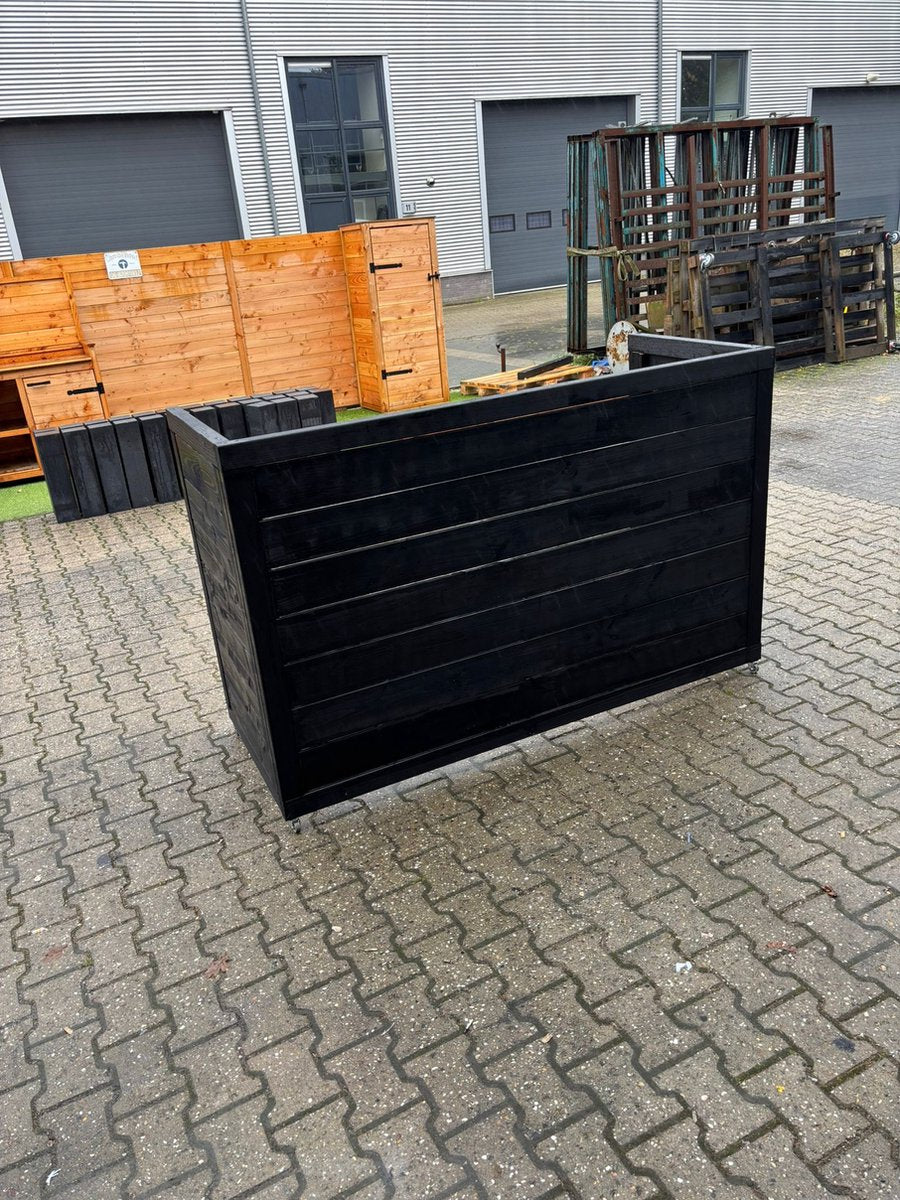 Containerombouw 3 kliko`s ombouw douglas zwart met wieltjes - kliko ombouw wordt in 3 schermen geleverd inclusief boorgaten en hoekijzers .Kliko Ombouw voor 3 containers-Containerberging-Containerkast -Container berging