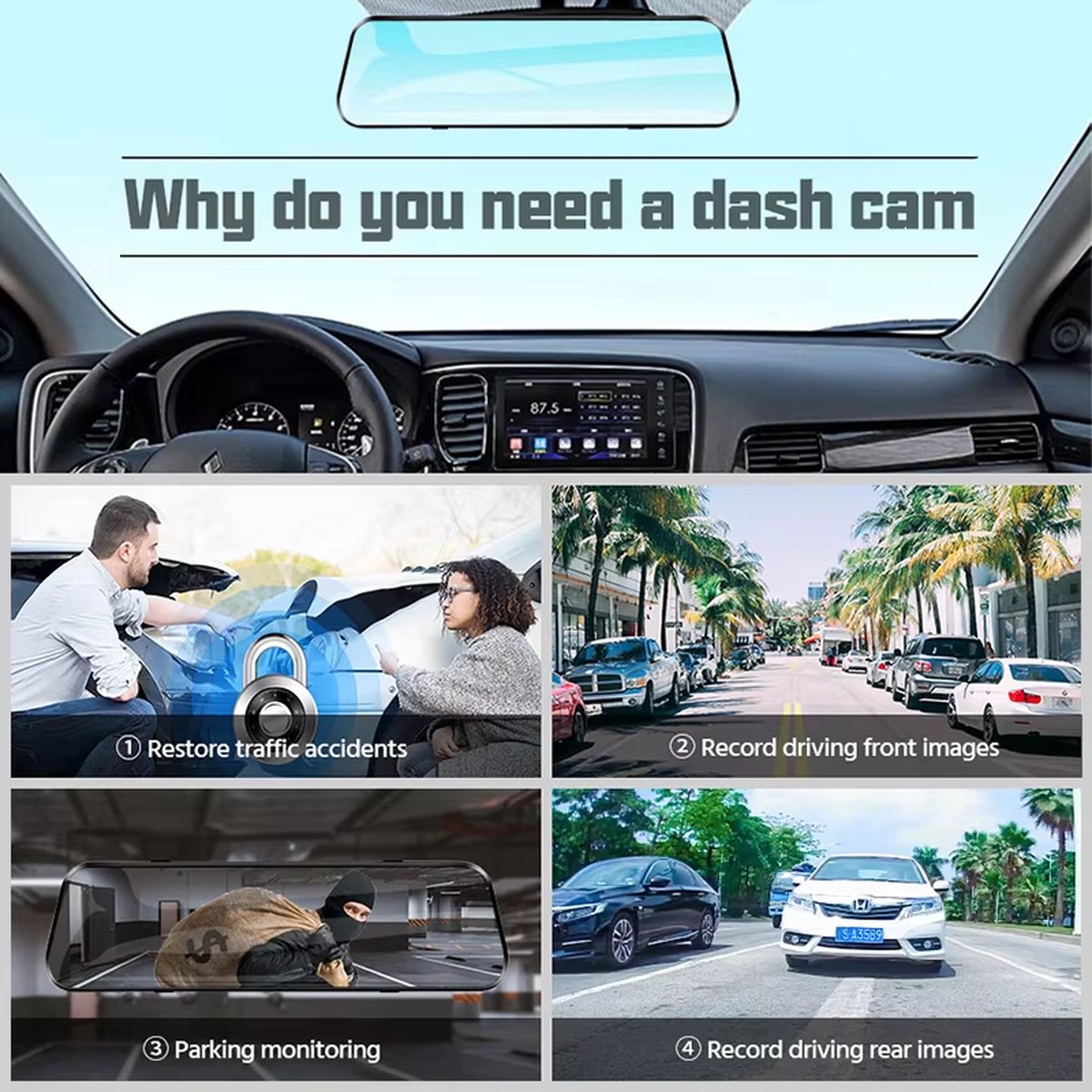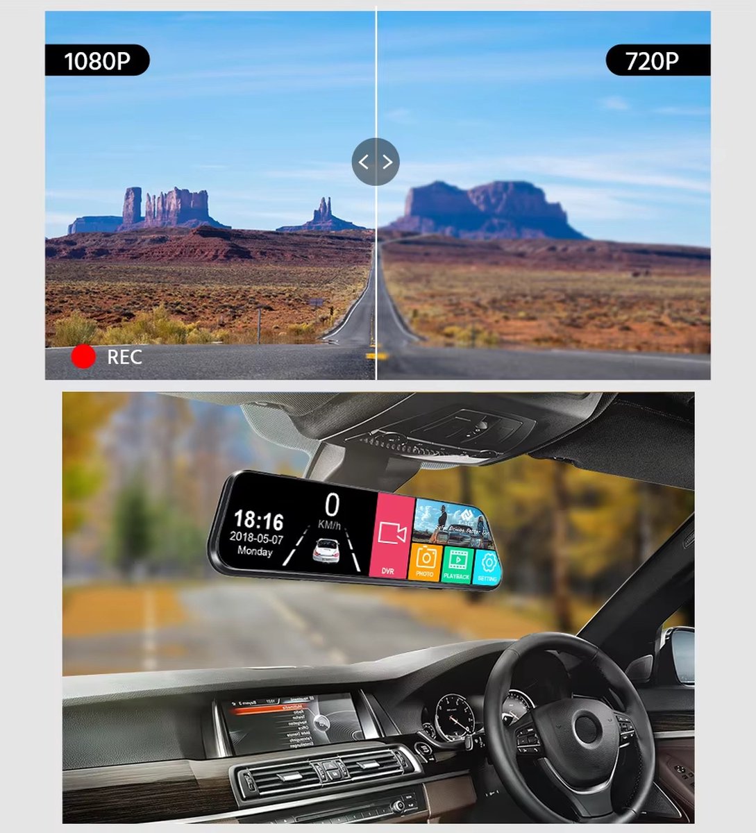 Ervaar ongekende beeldkwaliteit en gemak met de 4K Spiegel-Dashcam. Met een geavanceerde 4K-camera aan de voorkant en een 1080P-camera aan de achterkant, leg je elke rit in haarscherpe beelden vast. Het 10 inch IPS-touchscreen biedt een intuïtieve bediening en verbetert het zicht naar achteren. Dankzij de verstelbare achteruitrijlijnen en de meegeleverde 10 meter lange camerakabel is installatie een fluitje van een cent. Met functies zoals WDR voor superieure nachtzicht, IP69-waterdichte achteruitrijcamera en Type-C opladen, biedt deze dashcam ultieme duurzaamheid en functionaliteit. Veiligheid staat voorop met functies zoals loop-opname, G-sensor en 24-uurs parkeerbewaking.