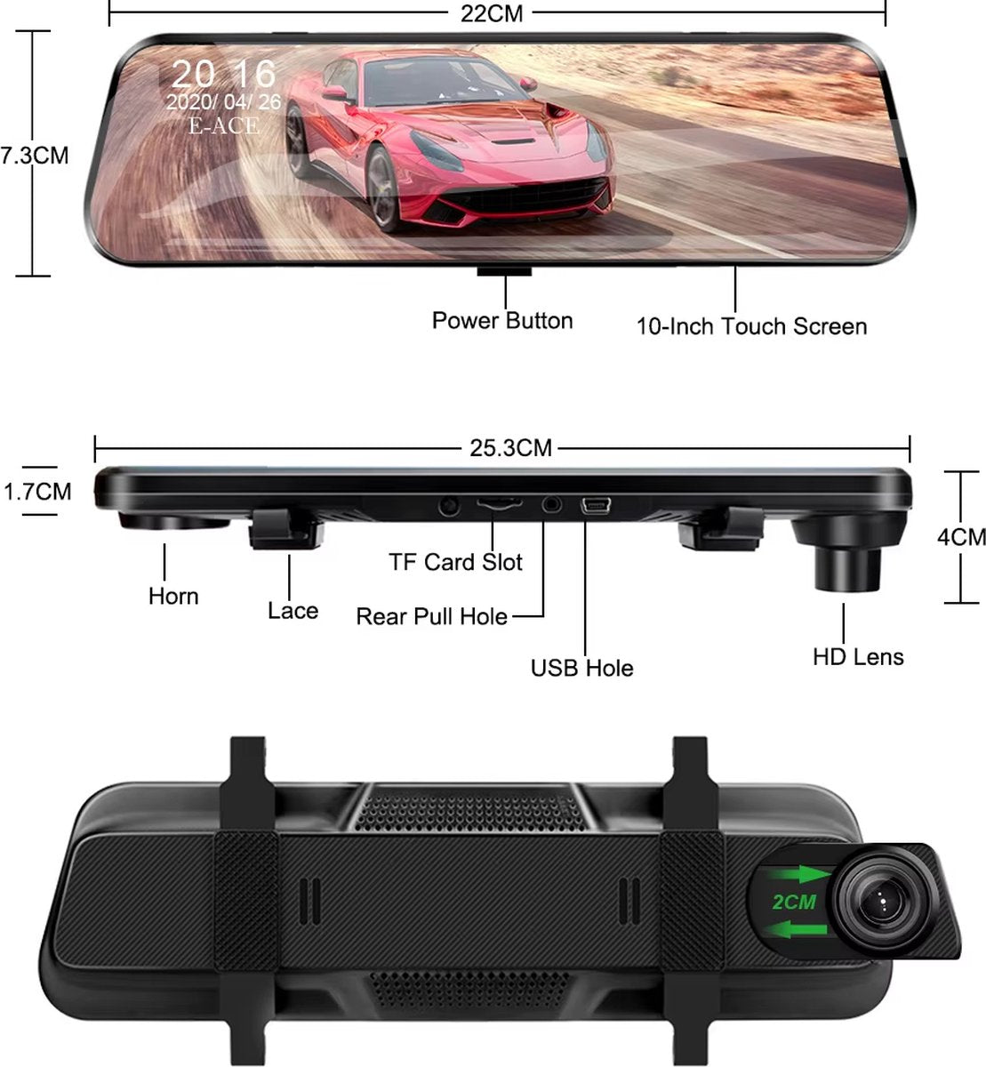 A 20P voorste cameralens is met 170 graden grote groothoek, en het heeft een 10 inch groot scherm, heeft een superweergave. Achteruitkijkcamera Lens is met een hoek van 140 graden, goed zicht voor tijdens het achteruitrijden.