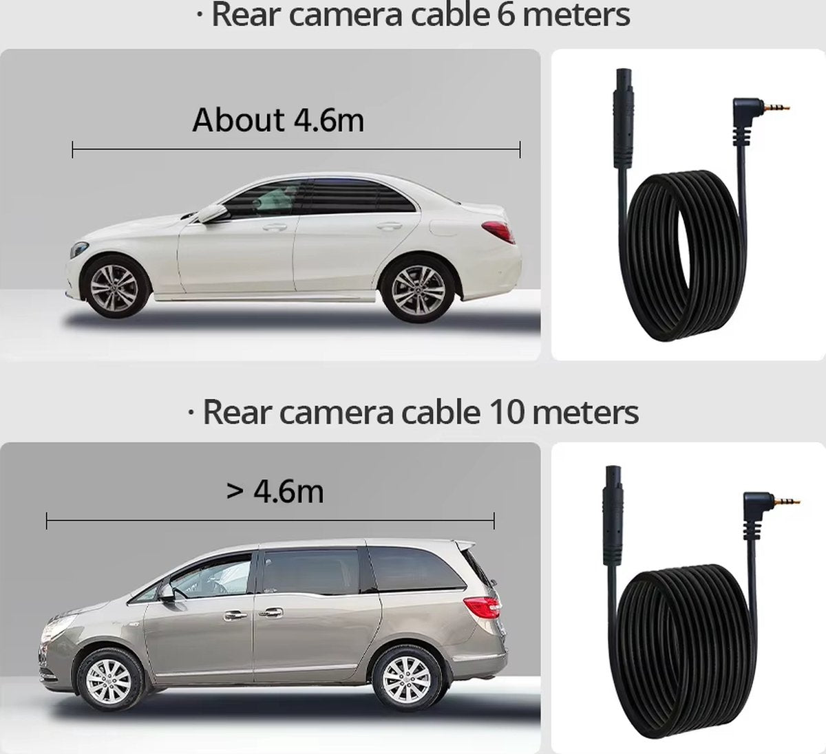 Er zijn 2 lengtes van de achteruitrijcamera (tot ongeveer 10 meter) kan worden gekozen, geschikt voor auto's van verschillende lengtes. Kies de achteruitrijcamera op basis van de lengte van uw auto.