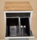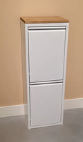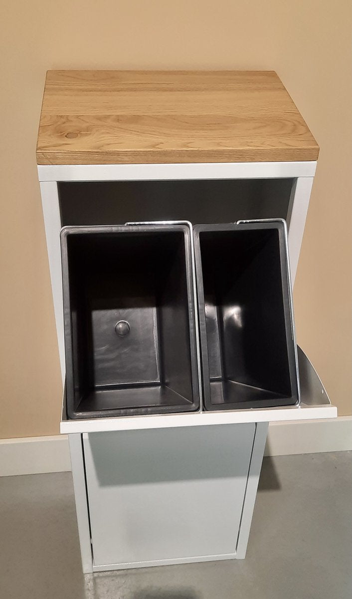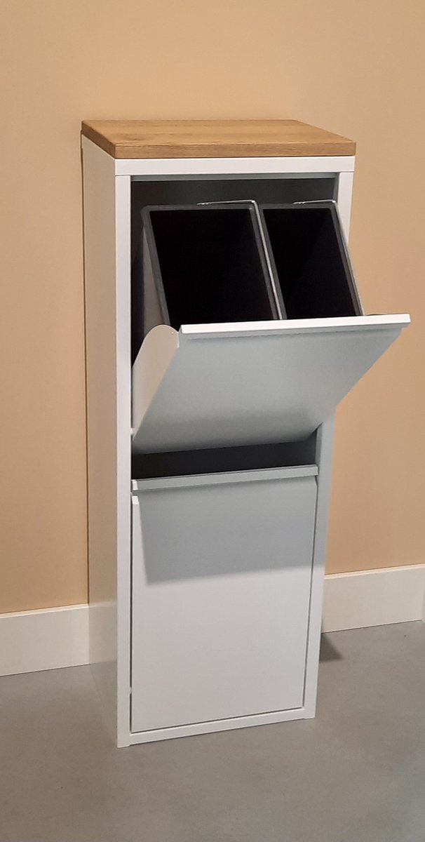 Beperkte ruimte in de keuken en toch afval scheiden? Dat kan met deze strakke moderne afvalbak met 3 binnenemmers. De vuilnisbak is wit met een massief eiken paneel op de bovenzijde. Het paneel is afgewerkt met een velling en mat invisible afgelakt waardoor het hout beschermd is. Hierdoor is de afvalemmer meer een meubelstuk dan een vuilnisemmer.