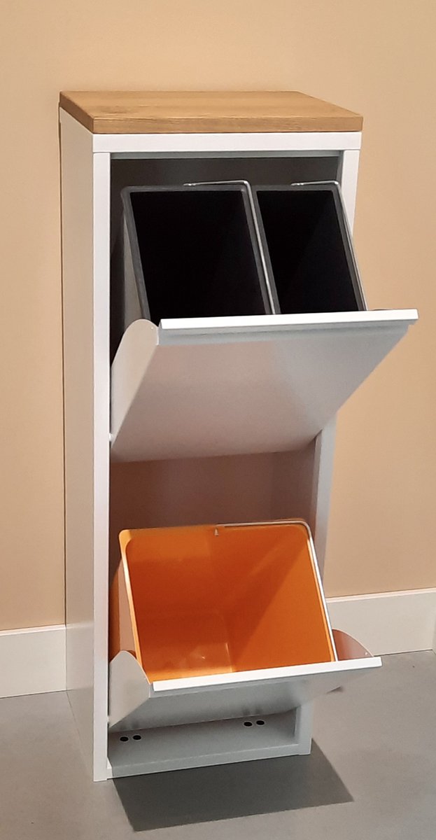 De fronten kantelen naar voren waardoor de binnenemmers zichtbaar worden. De drie binnenemmers zijn verschillend qua inhoud. De grootste emmer is 16 liter en kan bijvoorbeeld voor PMD afval gebruikt worden. De andere emmers zijn 10L en 7L deze kunnen bijvoorbeeld voor papier en restafval gebruikt worden. Uit ervaring met een 4 persoons huishouden weten wij dat een emmer van 10L voor rest afval na ongeveer 2 weken vol zit, mits het afval goed gescheiden wordt natuurlijk. De 7 liter emmer zou voor papier gebruikt kunnen worden. De meeste mensen lezen de krant digitaal dus het zullen vooral verpakkingen zijn die in de papierbak belanden. Of u gebruikt deze emmer voor GFT afval.