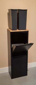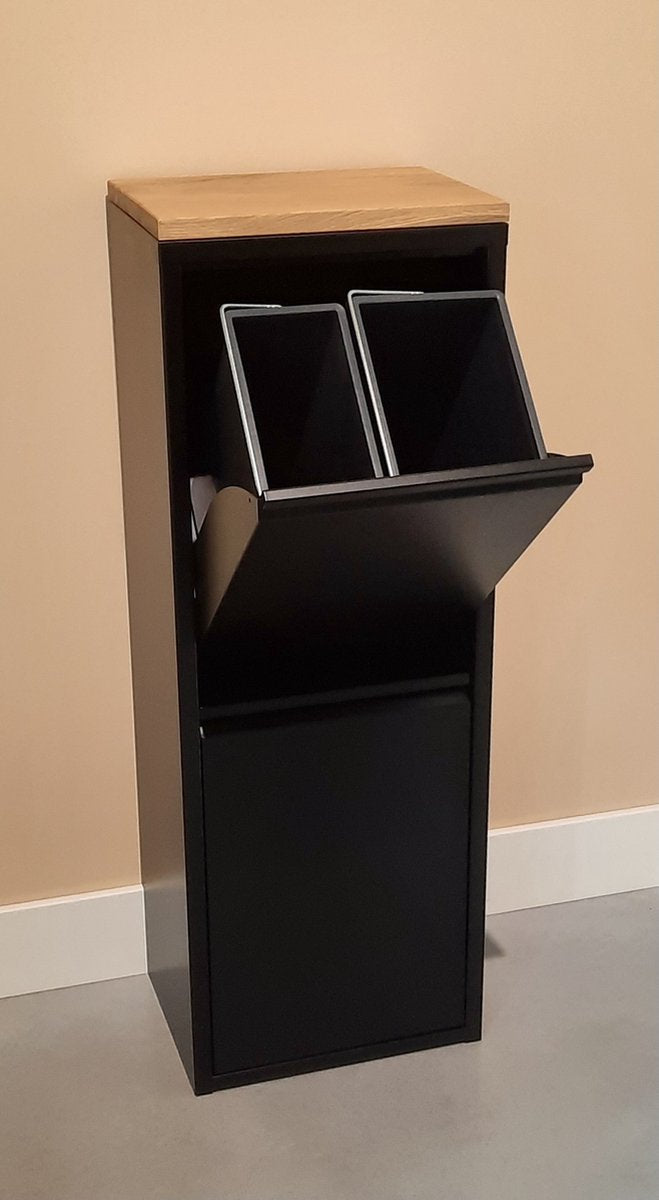 Beperkte ruimte in de keuken en toch afval scheiden? Dat kan met deze strakke moderne afvalbak met 3 binnenemmers. De vuilnisbak is mat zwart met een massief eiken paneel op de bovenzijde. Het paneel is afgewerkt met een velling en mat invisible afgelakt waardoor het hout beschermd is. Hierdoor is de afvalemmer meer een meubelstuk dan een vuilnisemmer.