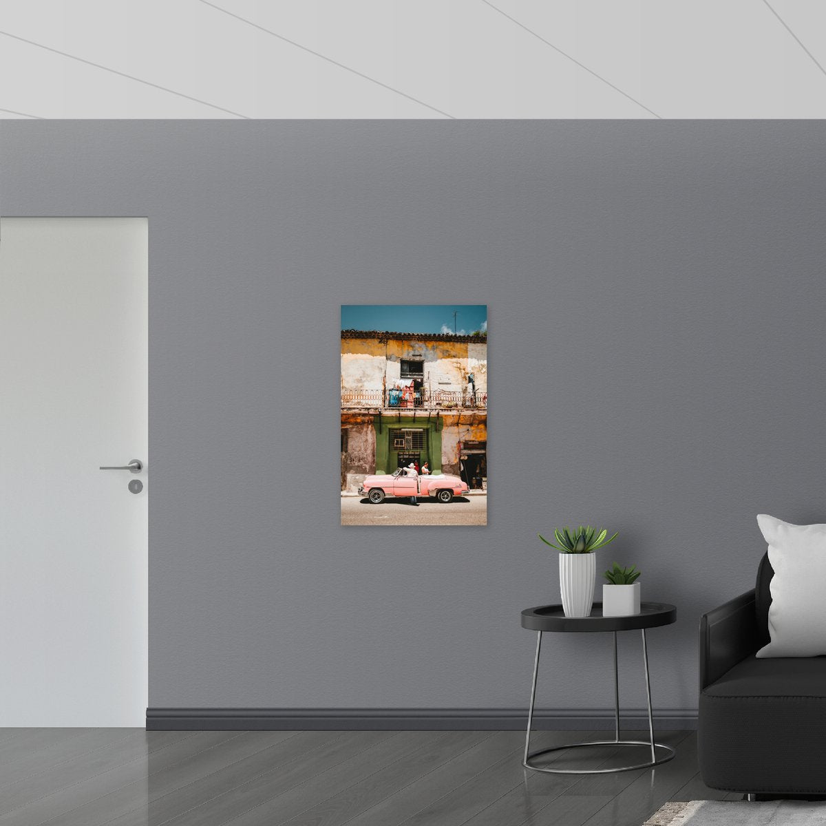 Dibond - Roze Cabrio Geparkeerd onder Traditioneel Italiaans Huisje - 60x90 cm Foto op Aluminium (Met Ophangsysteem)