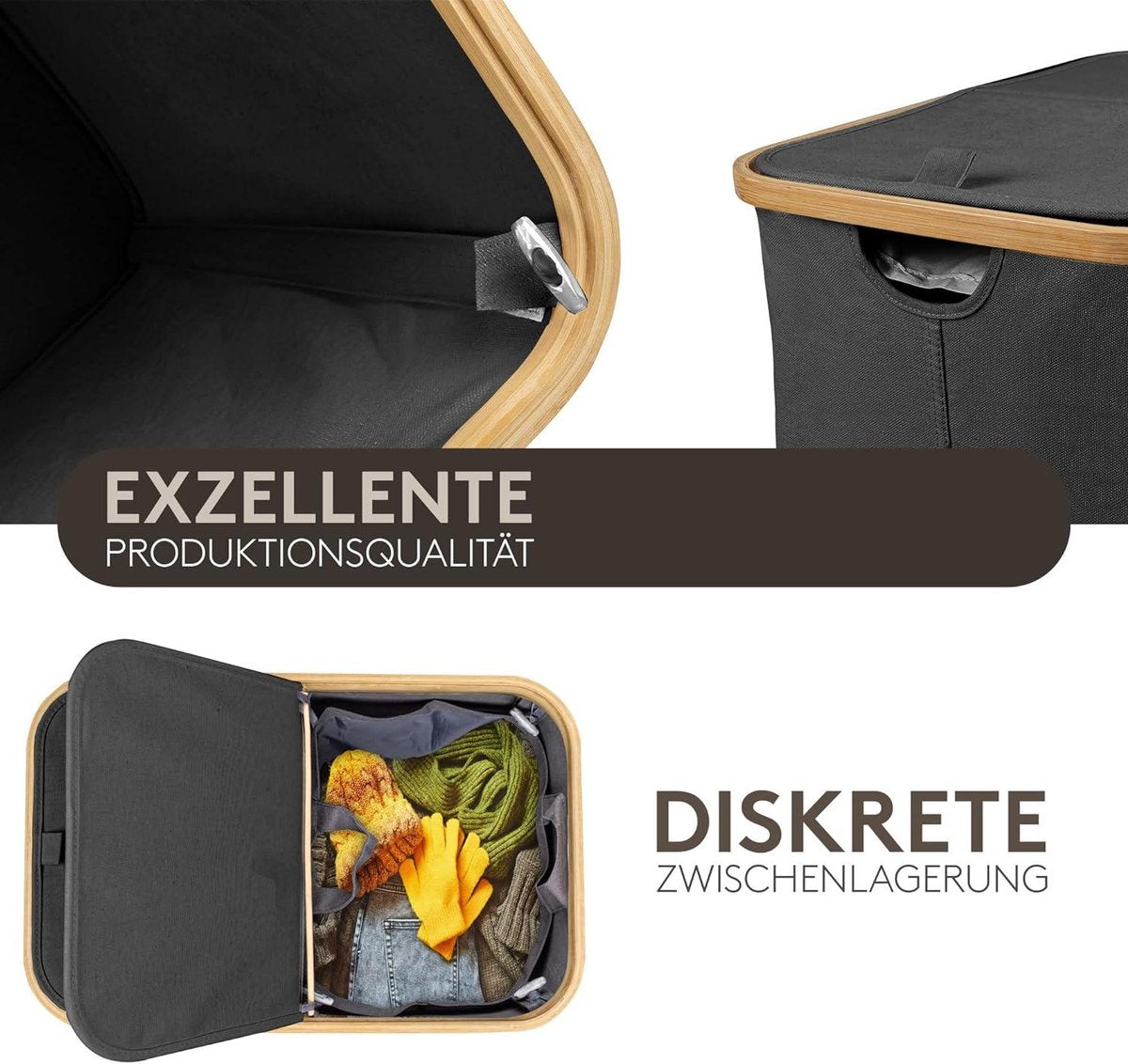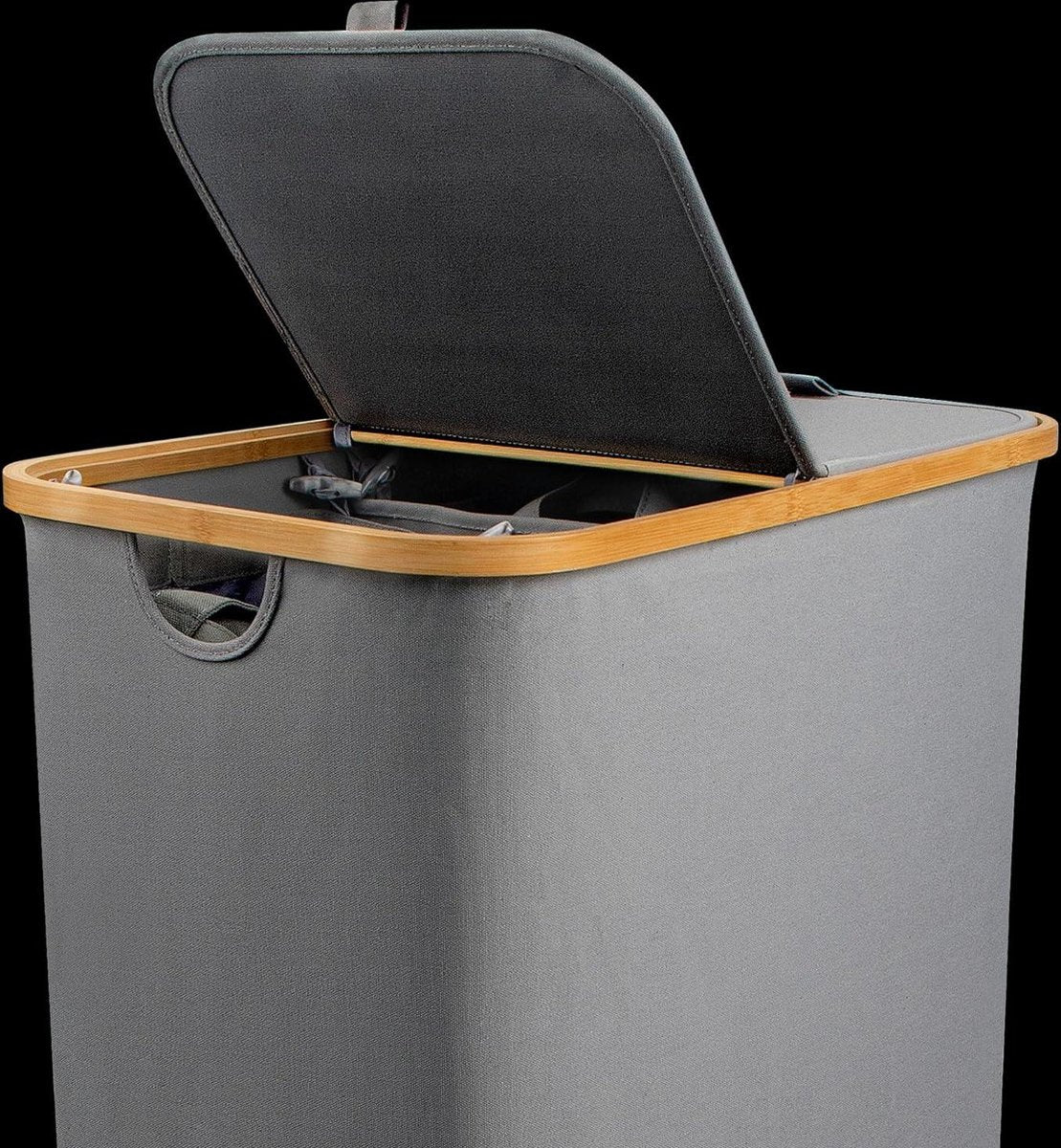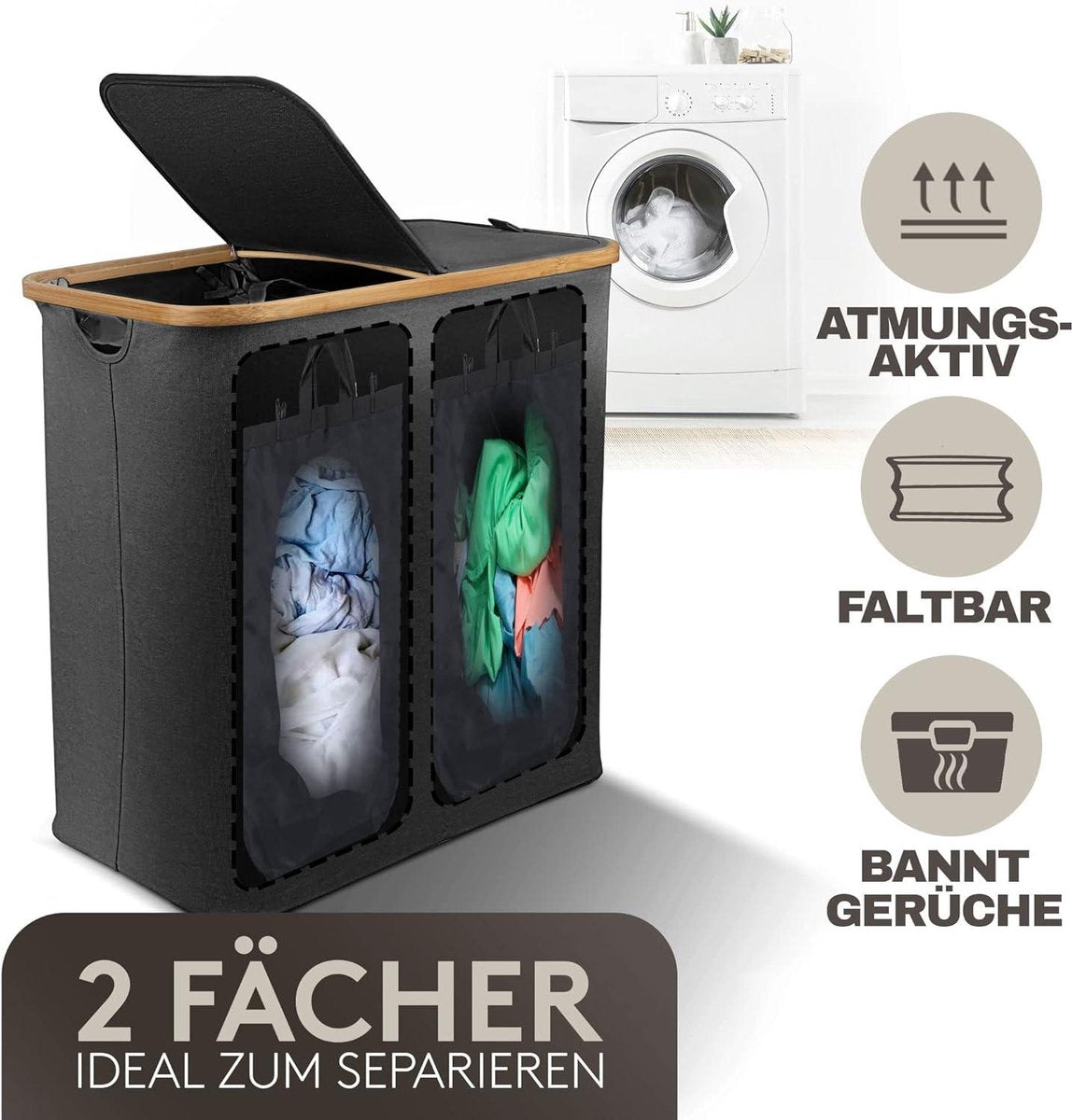 Donker Wasmand 2 vakken met deksel 100 liter bamboe-stof groot wassorteerder - donkergrijs antraciet zwart - milieuvriendelijk en duurzaam