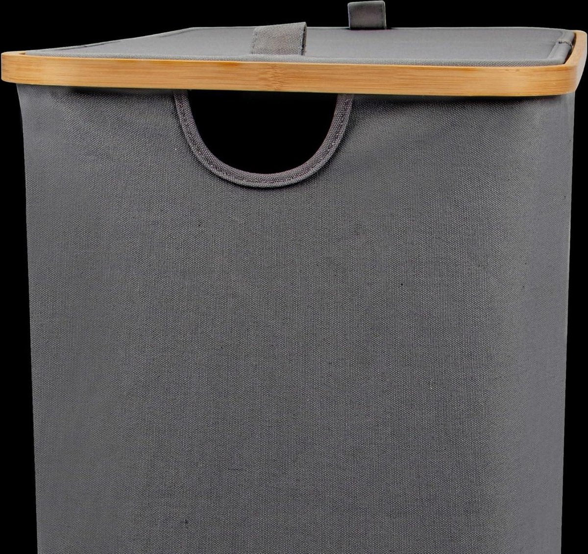Met onze hoekige wasmand in grijs kun je eindelijk je wasgoed op een discrete en ruimtebesparende manier opbergen. Het inklapbare deksel met bamboe inzetstuk zorgt ervoor dat er geen ongewenste geurtjes uit de wasmand komen. Daarnaast bieden de twee wasvakken de mogelijkheid om je wasgoed al te sorteren, waardoor je gemakkelijk de gesorteerde was direct naar de wasmachine kunt brengen. De extra grote opbergruimte en opvouwbare constructie maken deze wasmand een handig en praktisch item voor in huis.