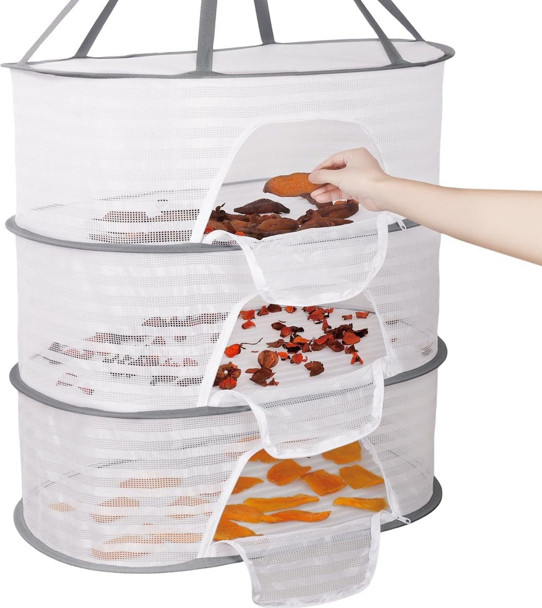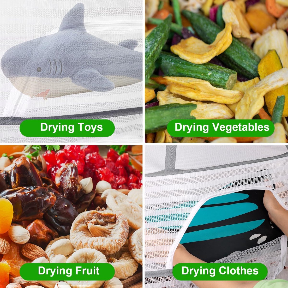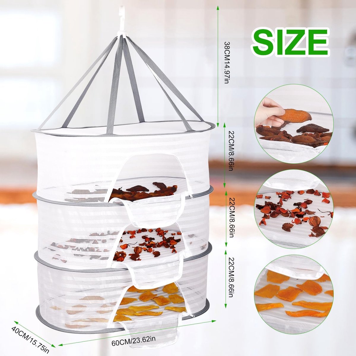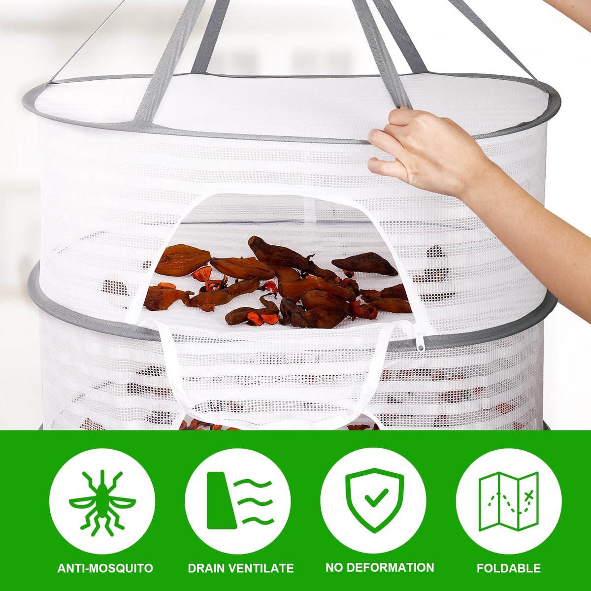 Inhoud en maat: je ontvangt een gaasdoek dat in 3 lagen hangt en je voldoende droogruimte kan bieden. Uitgebreide afmetingen: 60 x 40 x 104 cm. Premium materiaal: ons hangende net is gemaakt van ademend nylon net, goed luchtcirculatie-effect, licht en duurzaam. Het dikkere en sterkere windprofessionele riemontwerp is stabieler en niet gemakkelijk te vervormen. Stevig draadframe dat plat vouwt voor ruimtebesparende opslag. Praktisch ontwerp: dit bloemenrek is ademend en handig om voedsel op te bergen. 3 lagen en opvouwbaar ontwerp Zorg ervoor dat onze productie de oorspronkelijke vorm kan behouden zonder vervorming. Groot ritsontwerp: het hangende droogvisnet is ontworpen met een breder U-ritsontwerp dat gemakkelijk te openen en te sluiten is. Het is handig voor u om voedsel te verwijderen bij het openen en voorkomt effectief dat planten en kleding beschadigd raken bij het sluiten van wind of vogels. Brede toepassing: de droogrek is geschikt voor alle soorten planten zoals bloemen, vruchten, groenten, zelfs zeevruchten, vis en gedroogd vlees, sokken, poppen, enz. Je kunt het in plafonds, garages, tenten kweken enz.