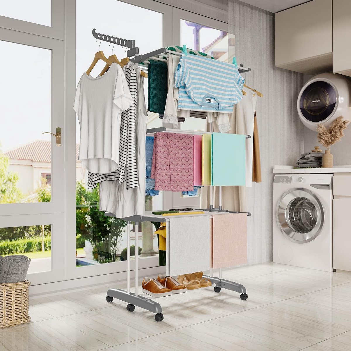 Droogrek toren, inklapbaar wasrek met 6 opvouwbare vleugels op 3 niveaus, inklapbare poten besparen ruimte binnen en buiten het huis (grijs)