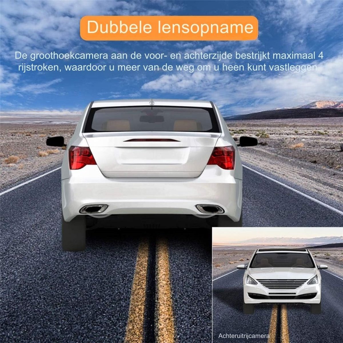 - Dual opname: Registreert zowel de voorkant als achterkant van je voertuig voor volledige dekking.