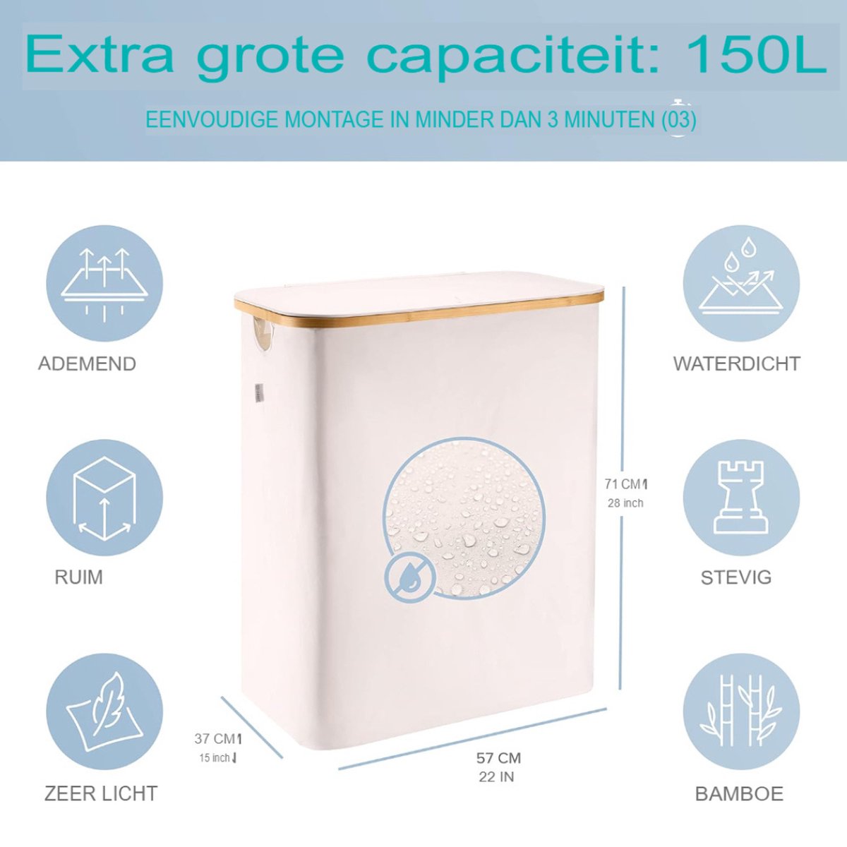 - Altijd opgeblazen: Onze opvouwbare wasmand is eenvoudig in elkaar te zetten. Je vindt de instructies in de verpakking. In minder dan 3 minuten is de wasmand gemonteerd en behoudt hij zijn vorm zonder in te storten.