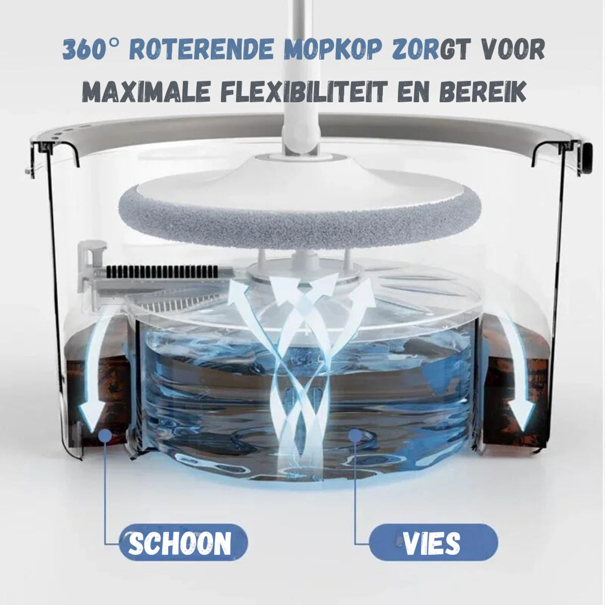 De 360° roterende mopkop zorgt voor maximale flexibiliteit en bereik, zodat u gemakkelijk onder meubels, in hoeken en rondom obstakels kunt schoonmaken. Deze functie maakt het schoonmaken van moeilijk bereikbare plekken eenvoudiger en grondiger, zodat geen enkel gebied wordt overgeslagen.