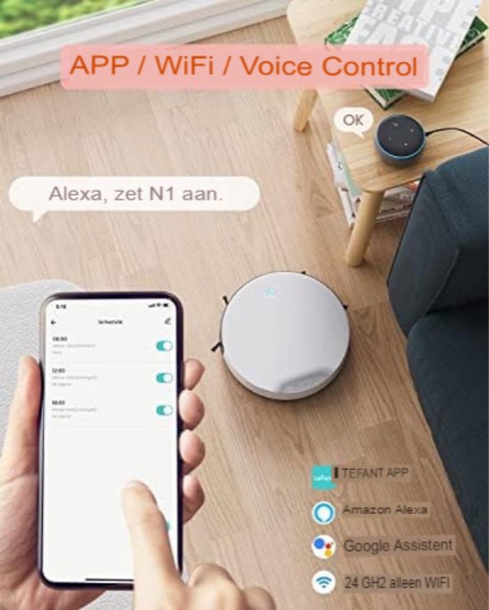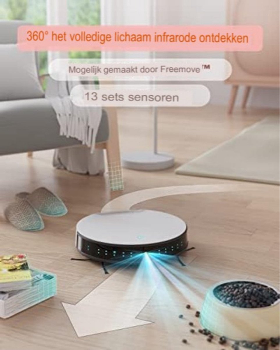 • Unieke zuigmond en sterke zuigkracht: Verwijder de onderste rolborstel en gebruik een ontwerp met grote zuigmond om haarpoeder te reinigen en problemen met haarreiniging te verminderen. De reinigingsefficiëntie is bijna 90%. Compacte behuizing met grote 560 ml stofcontainer om meer afval op te nemen en de stofzuigprestaties te verbeteren. Intelligente app en spraakbesturing: De N1 stofzuiger kan worden bediend via de Alexa en Google Home app en spraakopdrachten. Gebruik de Life app om de reinigingspaden te volgen, reinigingsschema's in te stellen, zuigkracht aan te passen, reinigingsmodus te veranderen, enz. Opmerking: ondersteunt alleen 2.4GHz WLAN FreeMove-technologie: Ingebouwde 6D-antibotsings-infraroodsensor in plaats van mechanische botsingen, omni-directionele 720-graden-detectie van de omgeving. Terwijl de rompgrootte wordt verkleind, is het gemakkelijker om obstakels te vermijden en storingen te verminderen die worden veroorzaakt door lichte slijtage, vervorming, stofophoping, enz. Kan trappen detecteren om vallen te voorkomen en gemakkelijk op tapijten te klimmen.